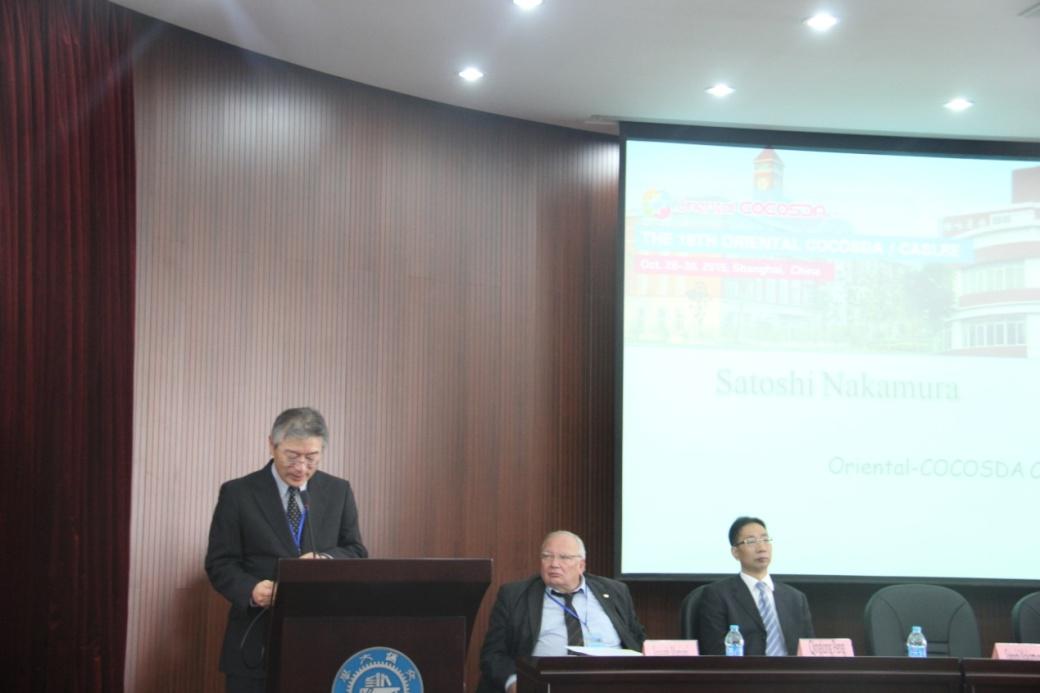 Oriental-COCOSDA 主席Satoshi Nakamura介绍了第十八届“口语语音资料库协调暨标准化国际研讨会东方分会”和“亚太口语语言研究和评价会议”的组织情况。该会议由国际语音数据库标准化协会COCOSDA(The International Committee for the Co-Ordination and Standardization of Speech Databases and Assessment Techniques)的亚洲分会主办,今年委托上海交通大学承办。O-COCOSDA是国际上关于语音数据库设计与构建、发布与评价、研究与应用等领域最重要的会议。自1998年第一次举办以来,每年会举办一次,到今年为止已经在日本、中国、新加坡、泰国、韩国、印尼、马来西亚、印度等地成功举办过,今年是第18届。会议交流及论文受到世界范围内相关领域研究人员的广泛关注,论文集由IEEE Xplore和EI收录检索。