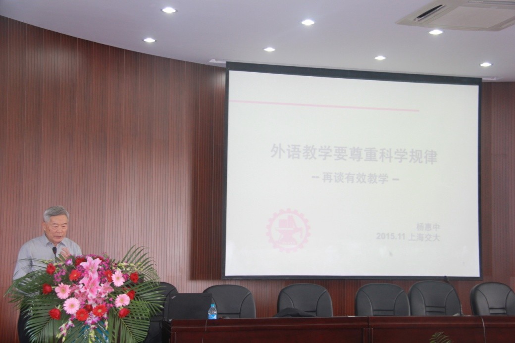 杨惠中教授作了《外语教学要尊重科学规律——正确处理几个关系》的主题发言,着重讨论了教学的有效性问题,并从有效性的角度讨论我国外语教学中需要正确处理的几个关系。杨教授肯定了几十年来大学外语教育所取得的成绩,同时对存在的问题提出了自己的观点。他提醒英语语言教学应当将语言教育的人文性融入到语言作为交流工具的教学过程中去,注重教学和测试的有效性;并指出应该提倡发展学生的审辩式思维能力。