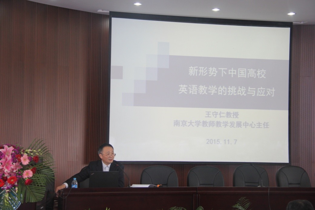 王守仁教授作了《新形势下中国高校英语教学的挑战与应对》的主题发言,分析了在高等教育大众化、高考改革、以慕课为代表的新型在线课程、学校教学计划的调整等给英语教学带来的挑战与机遇。他首先指出,在我国经济社会发展的新时期,外语教育应该加强,而非削弱;并结合《大学英语教学指南》中的基础目标、提高目标、发展目标,强调各个高校一方面以此为基准,一方面可根据本校实际,进行适当调整,突出自己学校的特色,并提到中国人民大学就制定了自己的英语口语能力标准、英语写作能力标准。针对学界热议的学术英语教学、跨文化交际能力培养、慕课微课的学习及教学三个问题,王教授阐述了自己的观点。此外,王教授还引用束定芳教授的话,鼓励研究者们积极参与国家教育改革发展,在重大事件中能学术研究者的声音。王教授在总结中指出,新形势下的中国高校英语教学更注重质量,更加个性化、多样化,更强调内涵发展、特色发展。