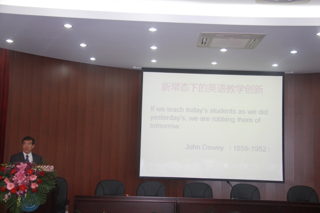 叶兴国教授作了《新常态下的英语课程教学创新》的主题发言,分析了在国家经济发展对英语人才巨大需求和信息通讯技术迅速发展的背景下,如何通过教学内容创新和教学手段创新实现培养目标。叶教授首先回顾了几十年来我国经济贸易增长与英语专业人才数量增长的正相关变化。接下来指出我们所处的大数据时代信息、知识传输方式、速度的迅猛变化对教育功能的挑战,提出了教育者面对这些挑战应树立的新理念。然后,叶教授详细阐释了面对新的形势英语人才培养的新标准,以及在教学材料、教学资源、教学方式、学习方法、学习环境等方面的人才培养新方法。在总结中他提到这些将成为英语教学的新常态。