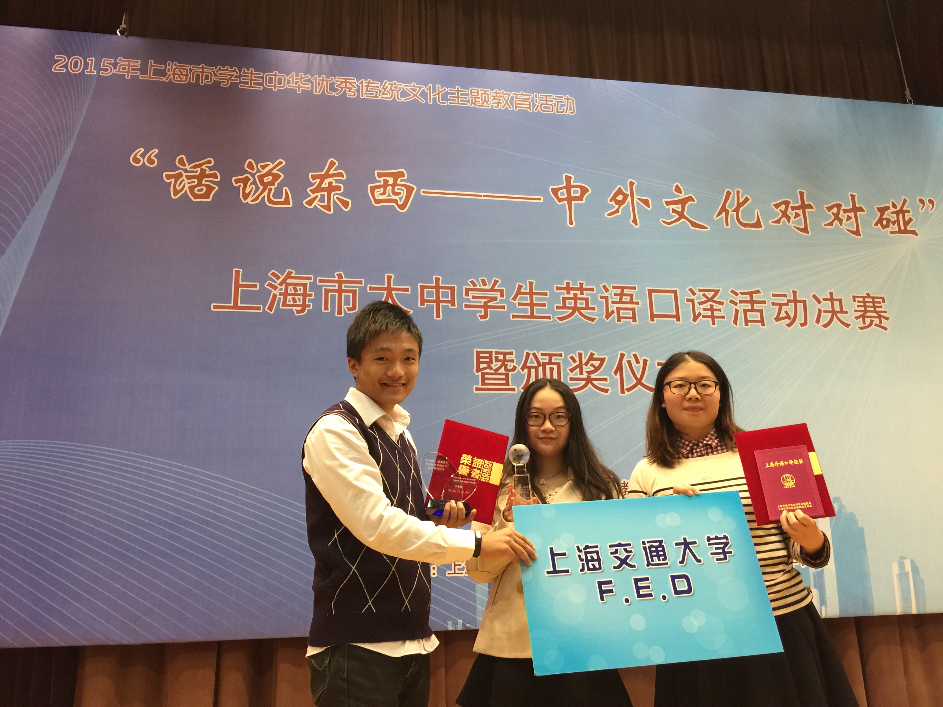 2015年12月5日,“话说东西——中外文化对对碰”上海市大中学生英语口译大赛决赛在上海市晋元高级中学举行。在大学组的比赛中,在开元网页版英语系戴融融老师的指导和带领下,来自上海交通大学开元网页版英美文学专业于歌,来自安泰经济与管理学院的钱羽斐(第二专业为英语)、医学院的吴非所组成的F.E.D队伍表现出色,经过三轮比赛的激烈角逐,获得团体一等奖;吴非同学获得全场“最佳风采奖”。