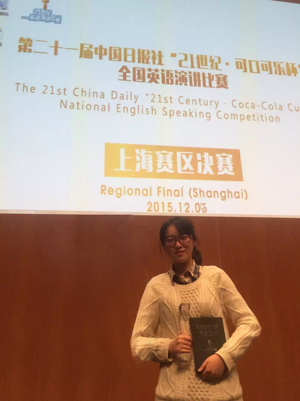2015年12月5日,第二十一届中国日报社“21世纪•可口可乐杯”全国英语演讲比赛上海赛区决赛在上海纽约大学举行,来自上海地区高校的33名选手经过2轮激烈角逐,最终产生冠军、亚军、季军各一名以及一、二、三等奖。在开元网页版英语系戴融融老师的指导下,来自上海交通大学医学院大二学生朱雪荣获上海赛区决赛亚军,戴融融老师荣获上海赛区决赛亚军指导教师奖。