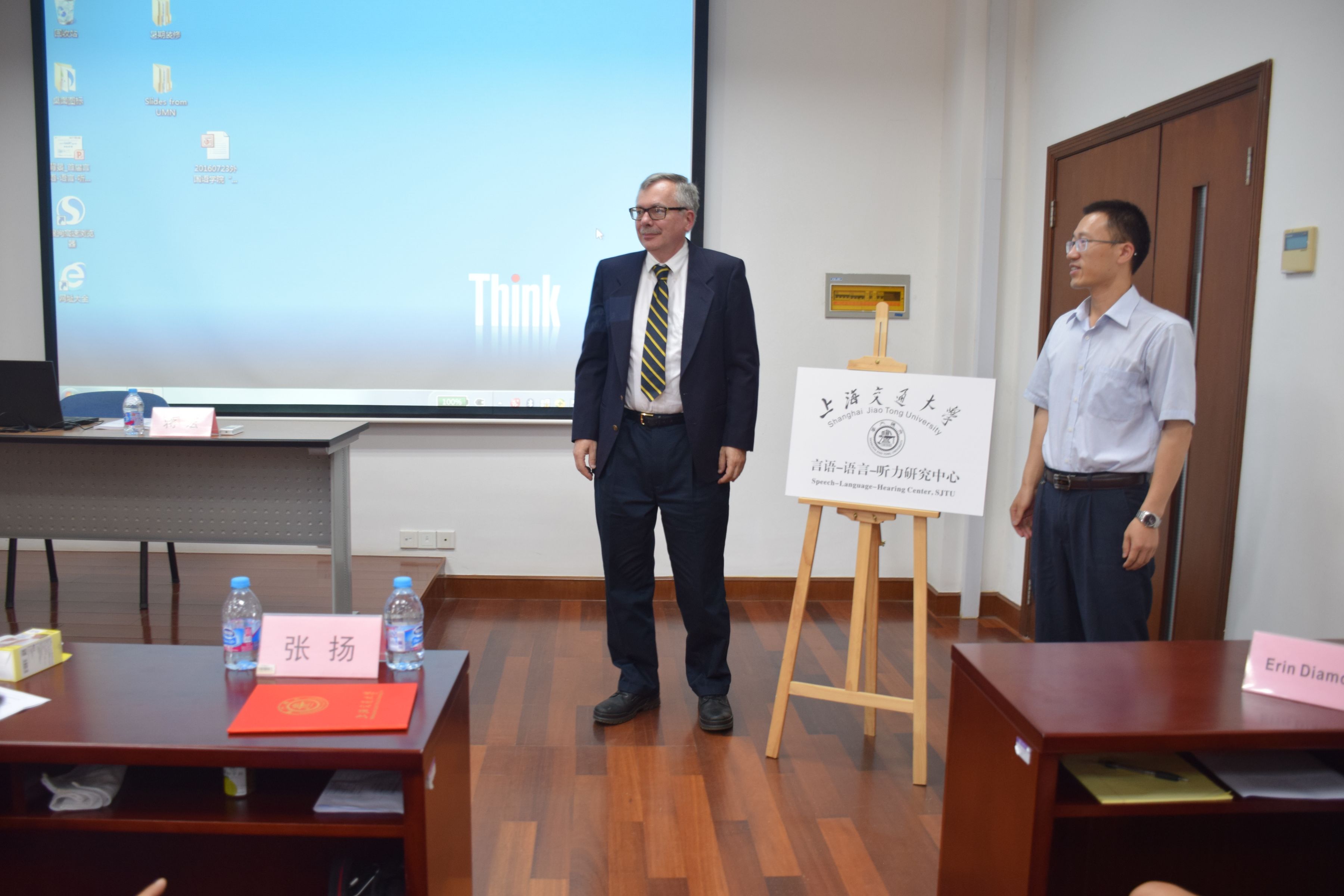 上海交通大学开元网页版副院长常辉教授与明尼苏达大学明尼苏达大学言语-语言-听力科学系主任Robert Schlauch共同为我院言语-语言-听力研究中心揭牌。同时,常辉教授还向明尼苏达大学言语-语言-听力科学系张扬博士颁发了上海交通大学访问特聘教授证书。张扬教授将在言语-语言-听力研究中心开展多项课题,促进本院与明尼苏达大学言语-语言-听力科学系的全面合作。揭牌仪式由院长助理陶庆副教授主持,出席仪式的还有言语-语言-听力研究中心负责人杨小虎副教授以及中心成员代表常欣副教授、汪玉霞博士、李菲博士等。