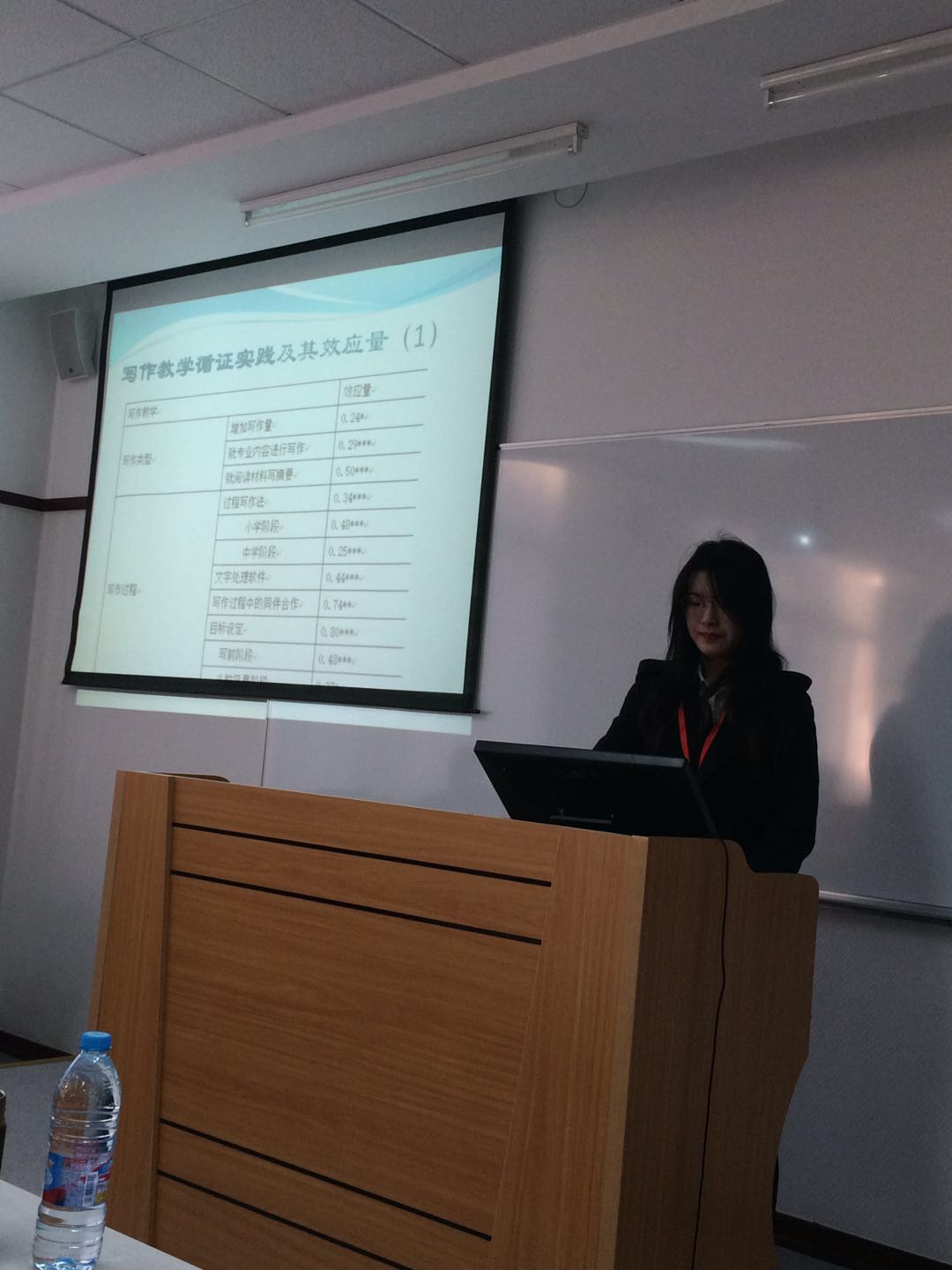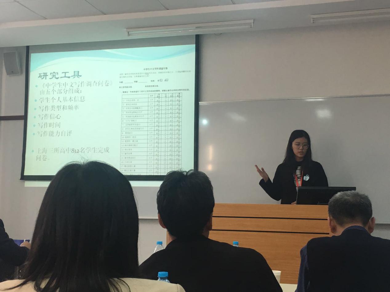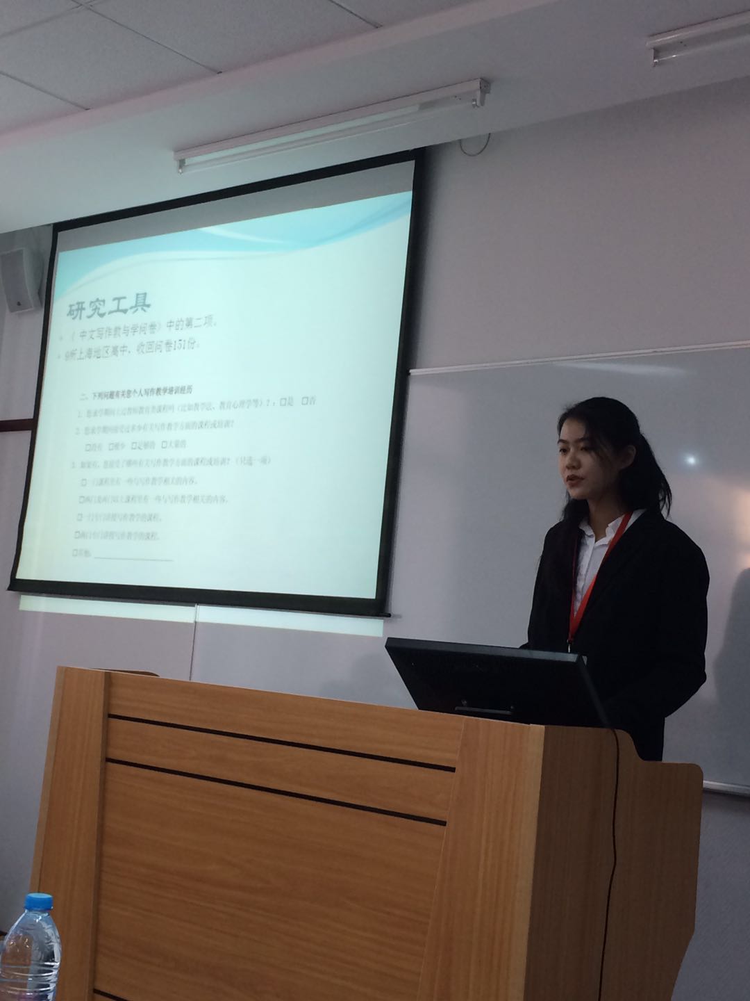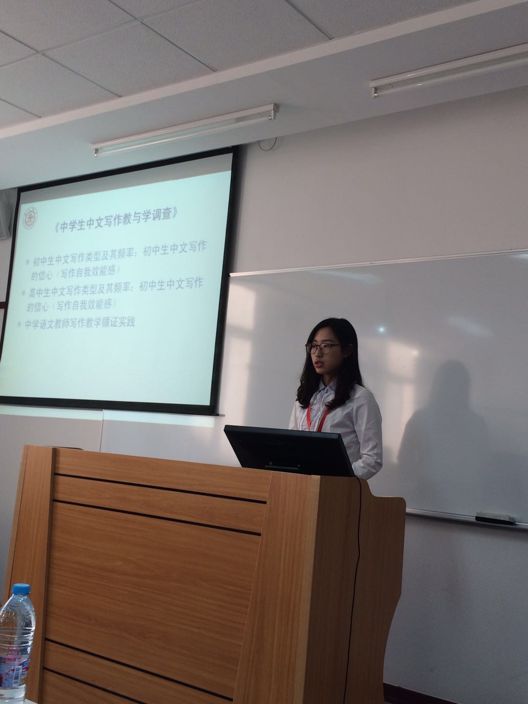 刘清怡同学以《中学语文教师写作教学专业发展现状与需求调查》为题做了报告。该调查发现,大部分受访教师认为自己在求学及在职期间有关写作方面的培训未能满足教学需求,希望接受更为系统和科学的专业指导。