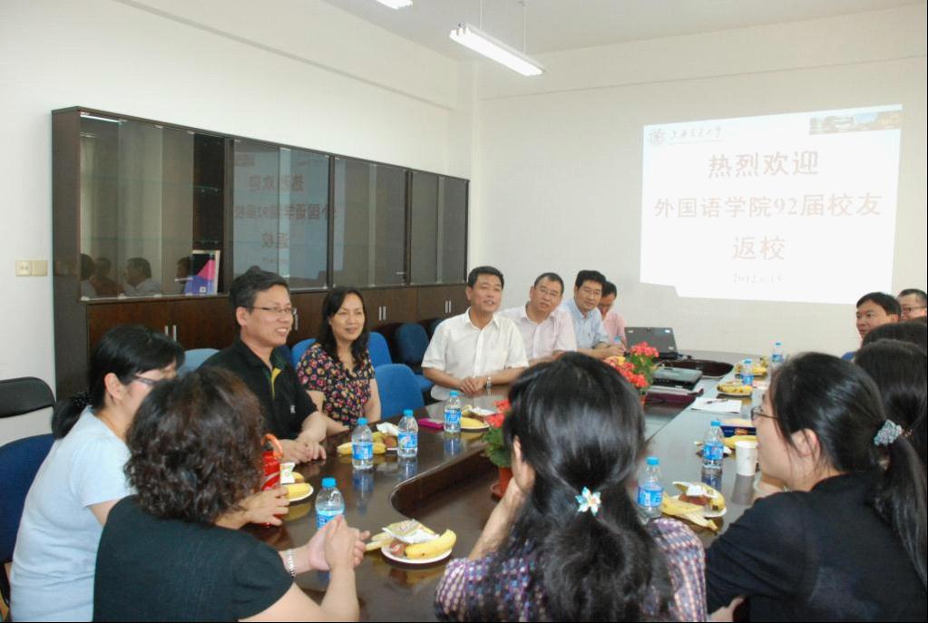 各位校友先后讲述了自己毕业后的发展情况。他们有的在外资企业从事翻译工作多年,有的留校任教,有的则自己开办贸易公司,还有的校友已移民国外。此次二十年后重聚首,他们深感学校变化之大,并对学院的快速发展赞叹不已。同时一些校友也特别强调了自己成长过程中老师们给予的关爱和帮助,向在座的胡开宝教授、曾经的辅导员张安胜老师和张红梅老师表示深深的感谢。
