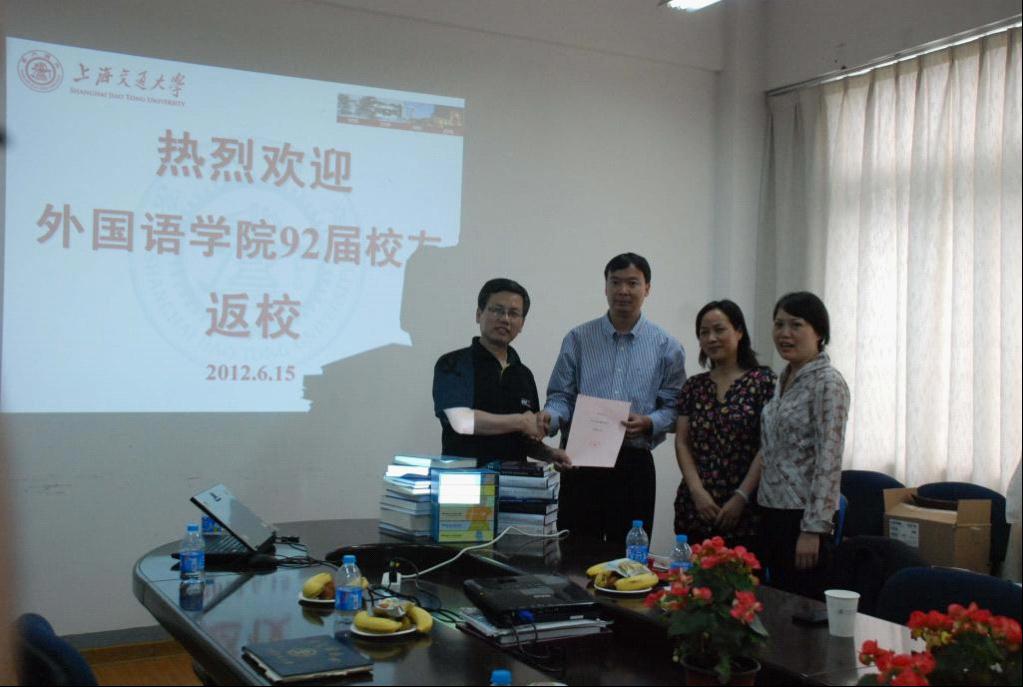 2012年6月15日,开元网页版科技英语系92届校友重聚开元网页版,并向学院资料室捐赠了一系列珍贵的外语类专业书籍。92届科技英语系班主任、电子信息与电气工程学院党委书记张安胜老师,开元网页版常务副院长胡开宝教授,党委副书记张红梅老师,出席了捐书仪式,并与校友座谈。