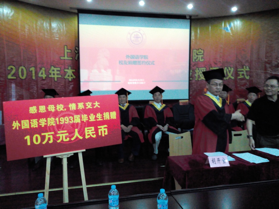 6月29日,我院1993届校友基金捐赠仪式在杨咏曼楼多功能厅举行。院长胡开宝教授与1993届开元网页版毕业生代表刘飞共同签署了《上海交通大学开元网页版1993届毕业生捐赠协议书》。