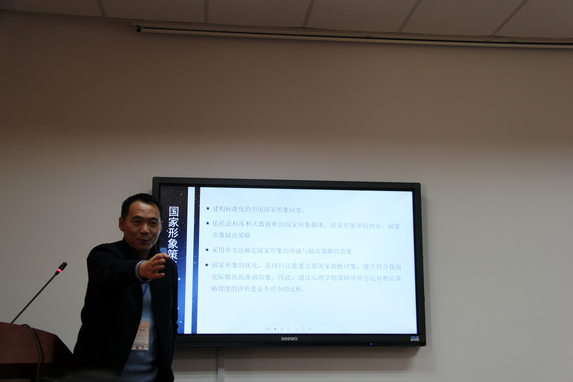 王沛教授认为“国家形象”在全球化时代显得特别重要,已经成为国家利益的重要内容。国家形象包括两个核心维度,一是能力(硬实力)大小 ,二是品质(软实力)好坏。他表示,中国国家形象的输出策略需要及时调整战略定位。他介绍道,未来的研究计划将按照以下步骤渐次开展:第一步,建立两个语料库:一个是建国以来我国国家形象语料库;一个是他国视野中中国形象语料库。第二步,基于语料库的分析结果,分析出国家形象的构建元素与认知元素,编制国家形象自我认知与他者认知的测评工具。第三步,探讨国家形象输出策略的优化机制。