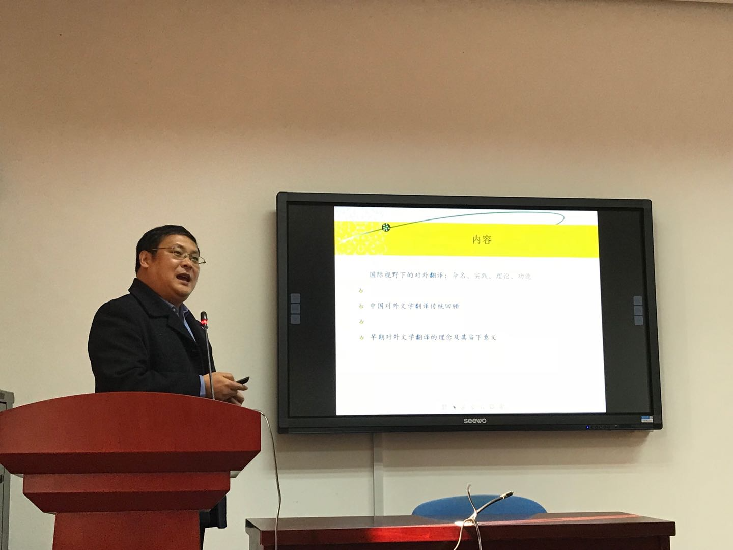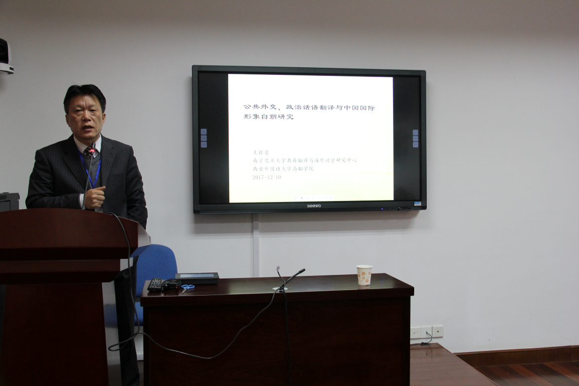 王银泉教授围绕公共外交、政治话语翻译这个主题谈中国形象的塑造。他认为所谓国家形象,指的是一个国家在国际间的政治、经济、文化、军事、科技、教育等诸多方面相互交往过程中,获得对方国家及其社会公众的解读、认知与评价。王银泉认为,国家形象塑造是公共外交实践的重要内容之一。提升中国国际话语权,需要实现对外传播方式创新,对外传播创新需要话语创新,话语创新需要翻译创新。而政治话语翻译不同于其他语用环境下的翻译,“政治等效”必须成为政治话语翻译的最高准则和基本原则。中国政治话语的英译策略应该关注如何改进和提高政治话语翻译效度,让国外受众“听到”、“听懂”中国政治话语,提升中国国际话语权,以期在此基础上更为有效地构建中国国际形象。