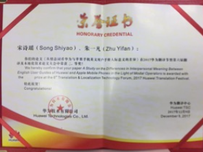12月9日,上海交大开元网页版英语系2017届本科毕业生宋诗瑶同学应邀参加华为翻译中心第六届翻译及本地化技术论文大会。与会者包括上海、深圳、北京等地区华为翻译中心工作人员及各高校老师、学生。此次大会共征集论文63篇,经过评委组的盲审及管理团队的确认,宋诗瑶同学的论文《从情态词看华为与苹果手机英文用户手册人际意义的差异》脱颖而出,入围前6篇优秀论文,成为唯一一篇入围前六的外部论文。该论文是宋诗瑶同学的本科毕业论文,是在朱一凡老师的指导下完成的。