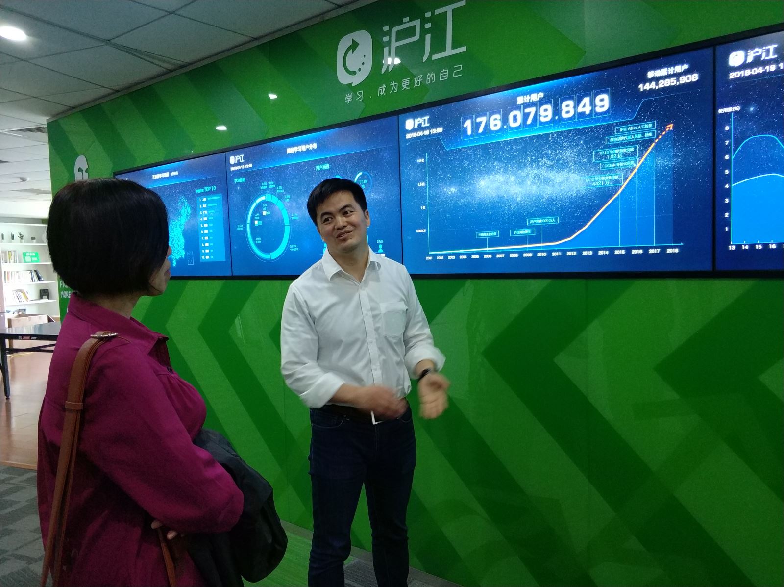 首先,沪江智能学习实验室首席AI科学家夏海荣先生带领丁红卫教授一行参观了沪江公司位于浦软大厦的办公区。夏先生介绍了沪江公司自成立以来的发展历史,目前的主要产品及其功能,以及公司的目标愿景。
