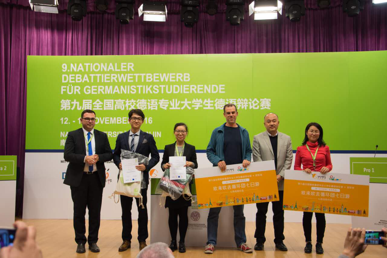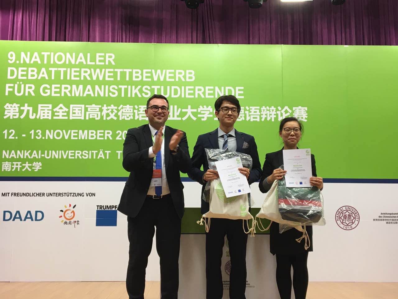 此次大赛共有来自全国各地48所高校的德语专业代表队参赛。比赛历时两天,经过初赛、八分之一、四分之一、半决赛的激烈角逐,最终上海交通大学和北京外国语大学两支代表队闯入决赛。在决赛中,两组选手唇枪舌战,针对一个主题进行分析、陈述并展开辩论,为观众们呈现了一场高水平的较量。我校选手吴非、袁文瑜凭借扎实的德语语言综合运用能力、出色的发挥和默契的配合,最终战胜对手,摘取了本次大赛的桂冠。他们以优异的表现赢得了评委们的高度赞扬,同时将获得由德国歌德学院提供的赴德一个月的培训课程奖励。我校代表队领队、指导教师黄晓艳和DAAD专家Marc Esser获得由歌德学院颁发的最佳指导教师证书。