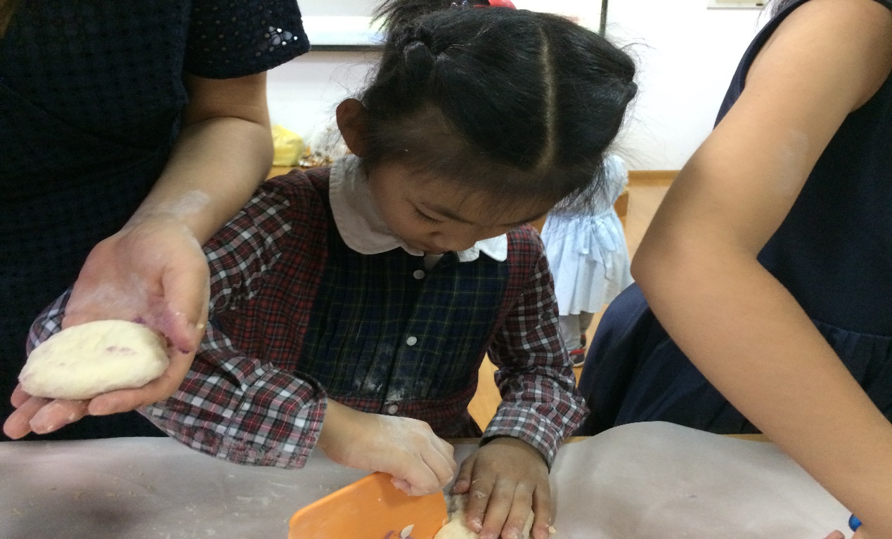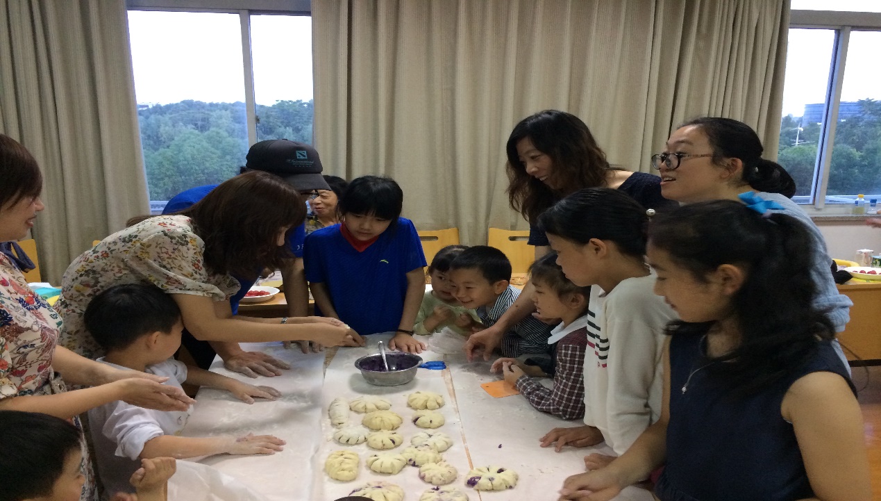第二个活动环节是烘烤面包。在学院烘培高手李鑫、朱一凡、杜燕、曹颖等老师的带领下,孩子们再次卷起袖子,伸出小手,模仿学习和面、揉面、醒面、包馅、捏花等一系列面包烘焙前的程序。在大人们的帮助下,孩子们巧手翻飞,形状各异、大小不一的面包就绪,只待放入烤箱。