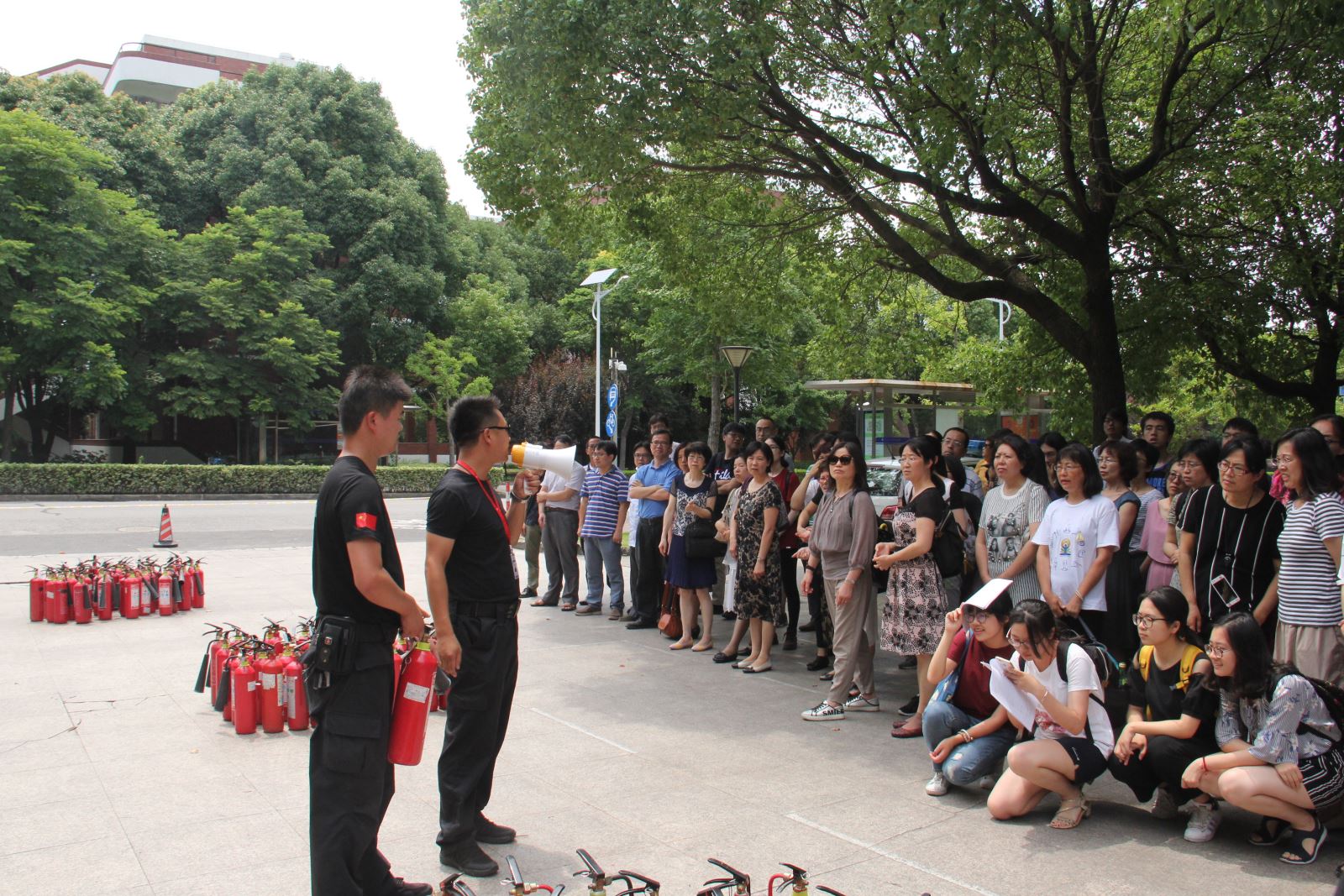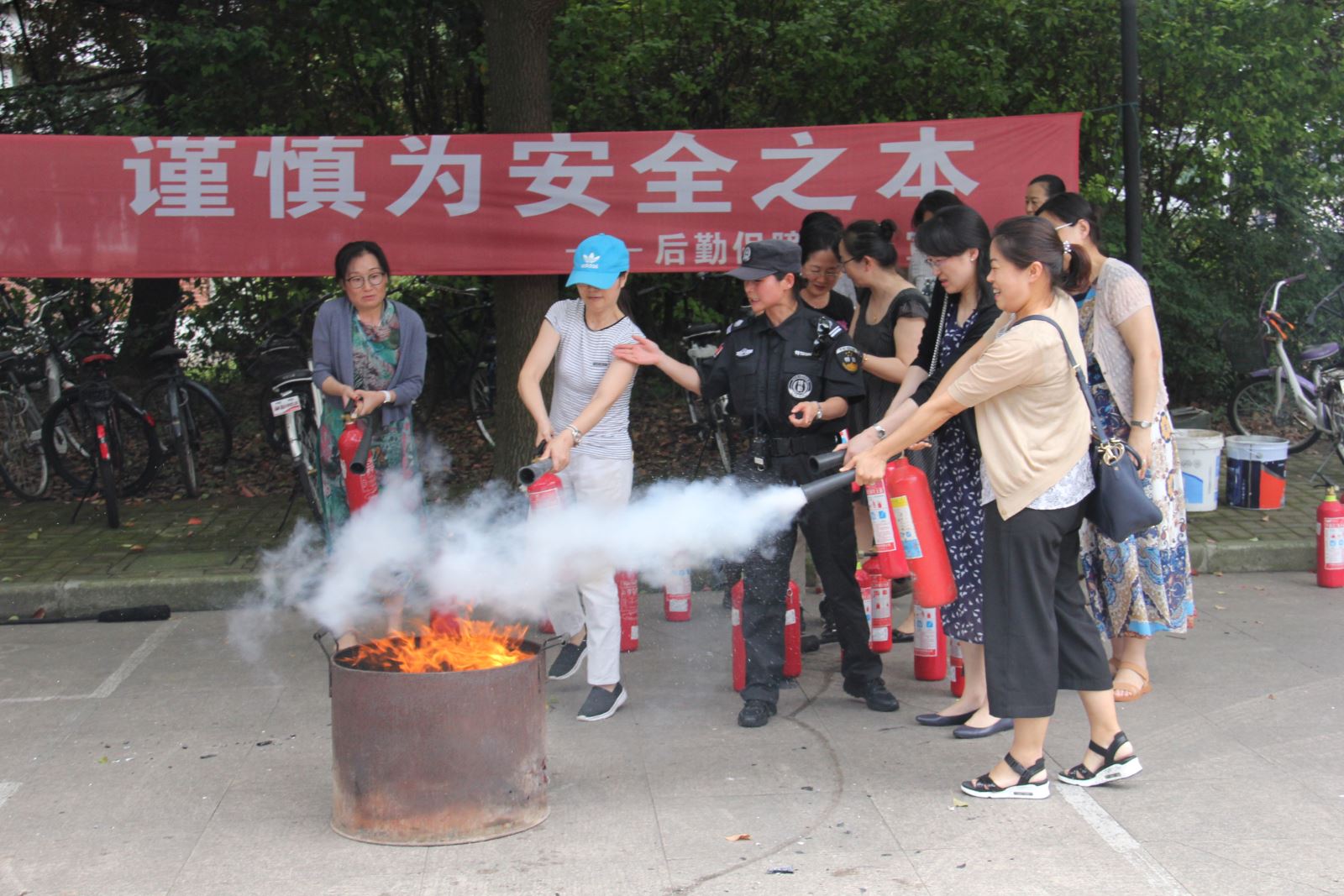 随后,全体人员来到外语楼外西广场,开始模拟灭火演练。消防科的老师讲解了灭火器的使用方法并进行演示后,正如同这炎热的天气,师生们热情高涨、积极认真地参与演练,快速、有效、安全地完成了灭火练习,获取了关于灭火的第一手感性认识。