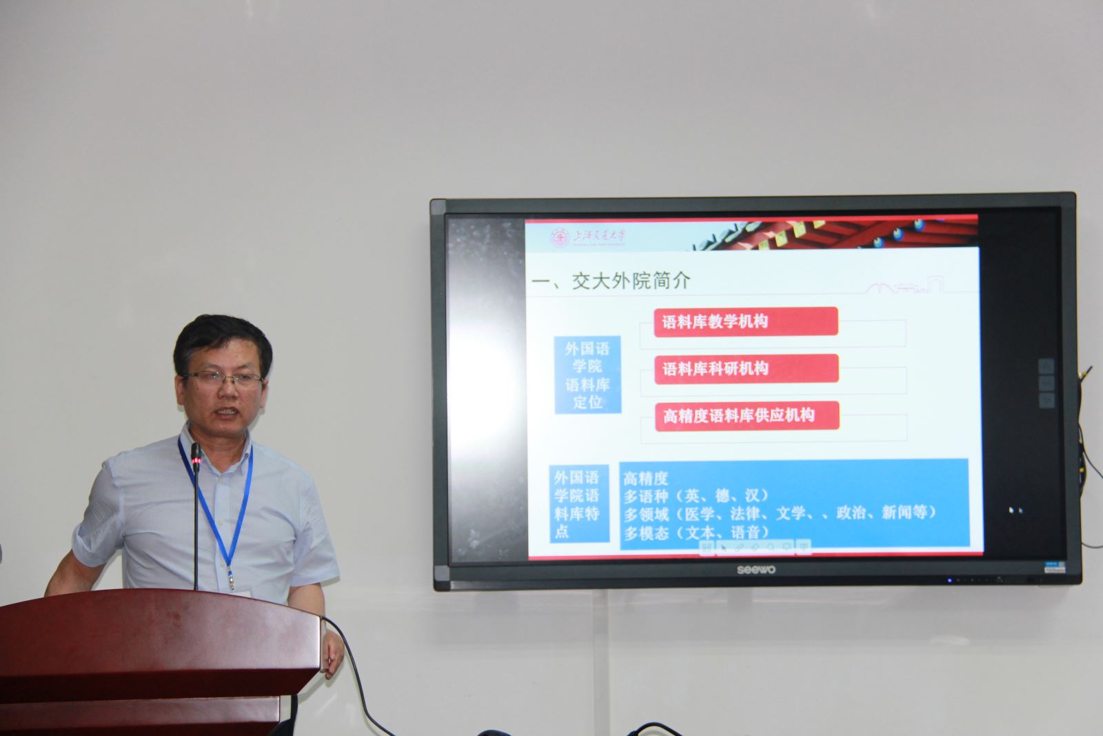 胡开宝首先致开幕辞。他对各位嘉宾和师生的参会表示欢迎,随后介绍了学院在平行语料库和语音语料库方面的建设及研究成果,以及学院代表性的产品与服务。同时,他介绍了学院即将组建语言智能实验室的计划,并且诚挚地邀请在座嘉宾来到学院展开系列讲座、担任语言智能的兼职导师。