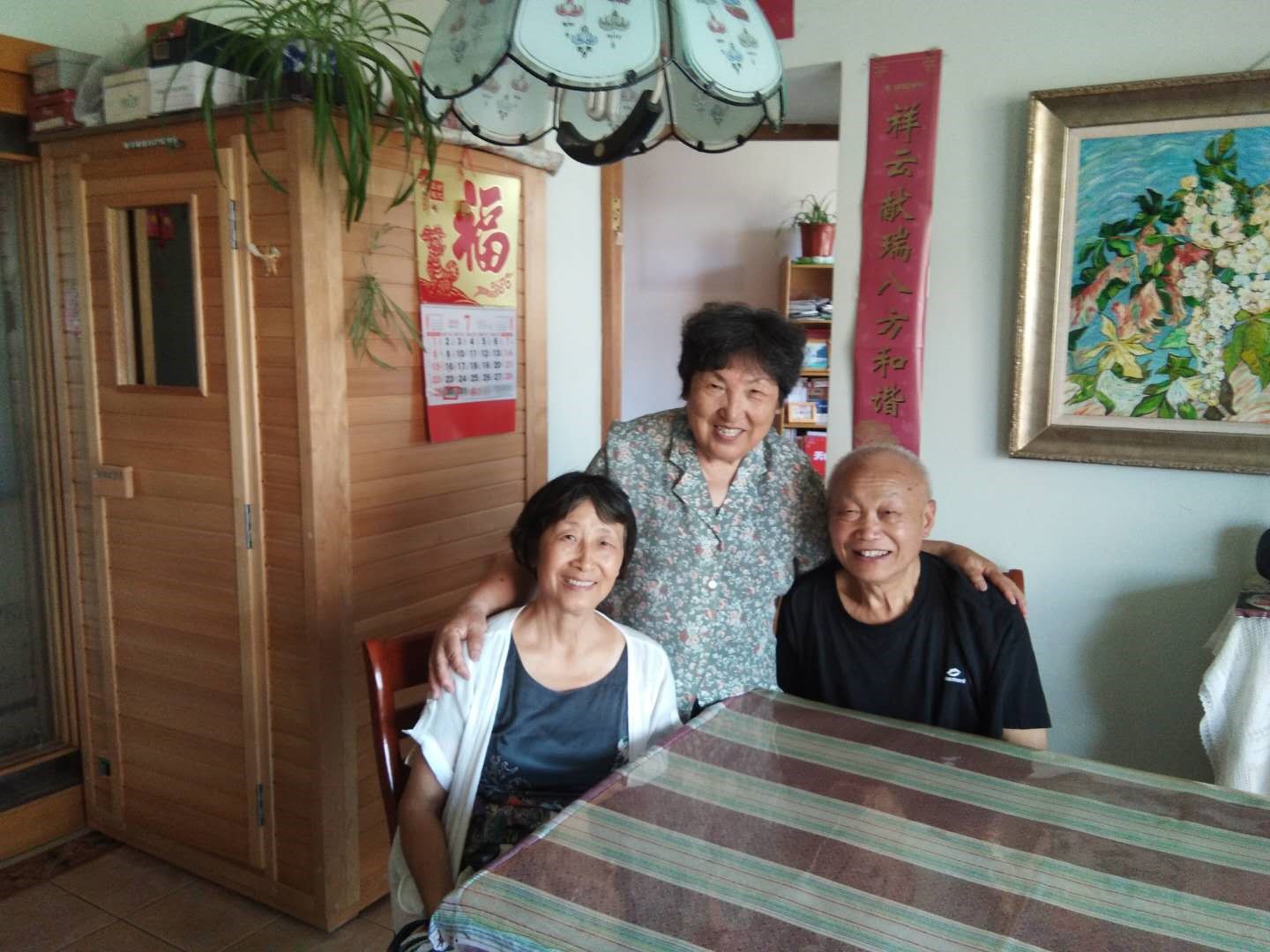 退休党支部书记何小凤老师看望顾济男(中)和徐润生老师(右)