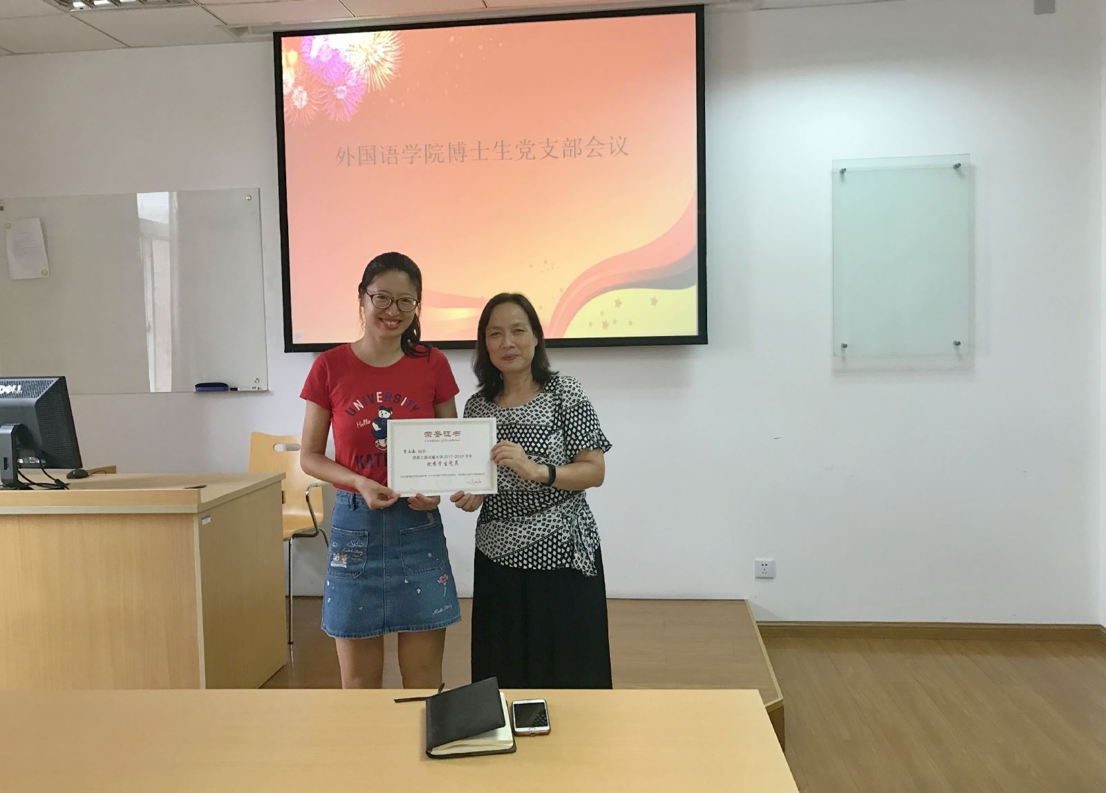 另外,会上张红梅老师还为支部中获得2017-2018学年学校优秀学生党员的贾玉嘉同学颁发荣誉证书。贾玉嘉表示师长的鼓励铭记于心,一定不负众望再接再厉,继续做好党支部工作。