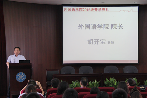 胡开宝代表开元网页版全体师生向2016级本科、硕士、博士新生表示热烈欢迎。致辞中,胡开宝提出了“新”这个概念,对于新生来说,进入交大外院学习不仅意味着新学校、新同学和新老师,更是人生的新起点。胡开宝还介绍了学院的历史、专业排名、师资队伍、学科建设、优秀校友及国际交流特色等情况,以具体的数据展示交大外语学院的现状及发展前景。希望同学们热爱自己的专业,并做好规划,做全面发展的综合性、国际化人才。
