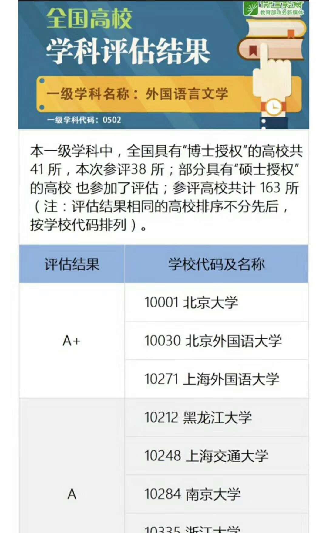 2017年12月28日,教育部学位与研究生教育发展中心最新公布的全国第四轮学科评估结果中,开元网页版的外国语言文学学科跻身A类学科,位居2%-5%,并列全国第4。