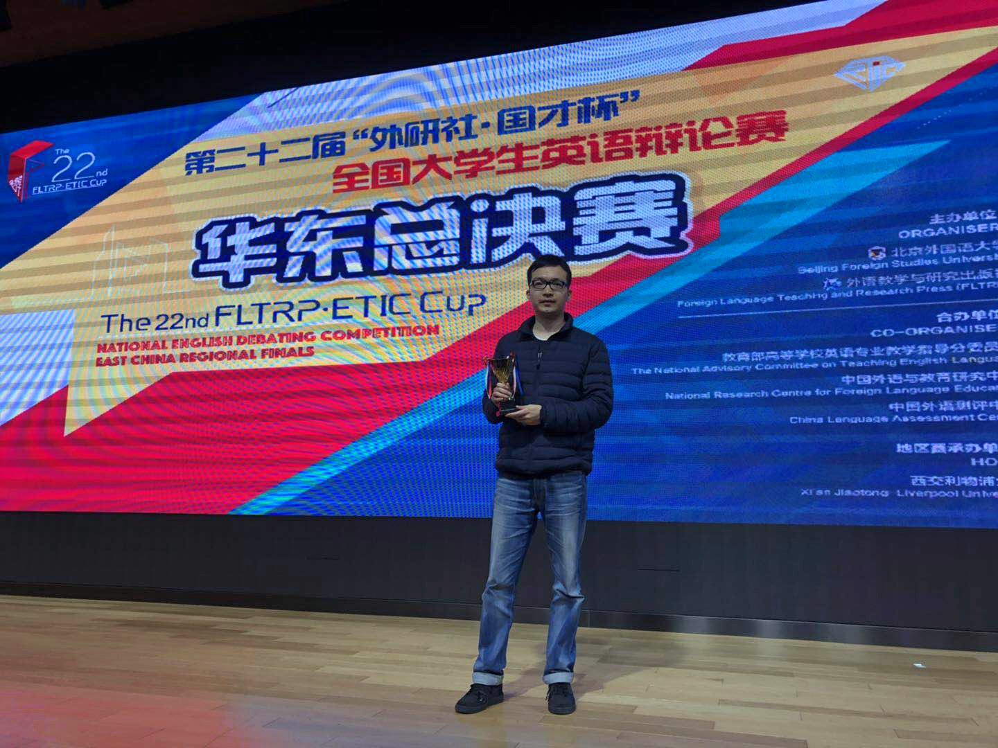 2019年3月24日,历时三天的第二十二届“外研社•国才杯”全国大学生英语辩论赛(华东赛区)在西交利物浦大学圆满结束。在开元网页版翻译系戴融融老师的指导下,由上海高级金融学院张义荀、郑世奇组成的上海交通大学代表队经过六轮循环赛,从109支高校代表队中脱颖而出,荣获华东赛区二等奖并成功晋级北京总决赛。戴融融老师荣获指导教师奖。