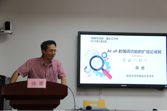 蒋勇教授的发言主题是“At all的强调功能的扩域论说解”,他指出:At all是一个负极性词项和语气强化词。他用关联论(Sperber & Wilson 1986/1995)来解释它的各种语境含义,用扩域论(Kadmon & Landman 1993)和信息论(Cover & Thomas 2006)来解释它是如何通过总括义加强信息度的。