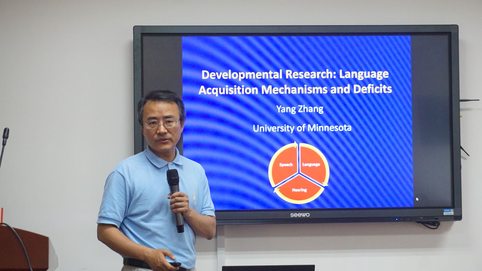 随后,美国明尼苏达大学双城分校言语语言听力科学系教授、神经行为发展研究中心教授、上海交通大学访问教授张扬老师作为演讲嘉宾之一致辞。张教授指出,作为上海交通大学闵行校区第一届学生,他对于母校有着深厚感情。目前语言听力科学以及神经行为发展研究是国际热门领域,许多公司也在参与,而其中的重点在于方法的推进,只有学会方法,我们才能投入到具体的研究当中,从不同角度探讨其理论和社会价值。通过帮助学生以及自己解决问题,不断提升,张教授相信该领域的研究将发展得更为全面。