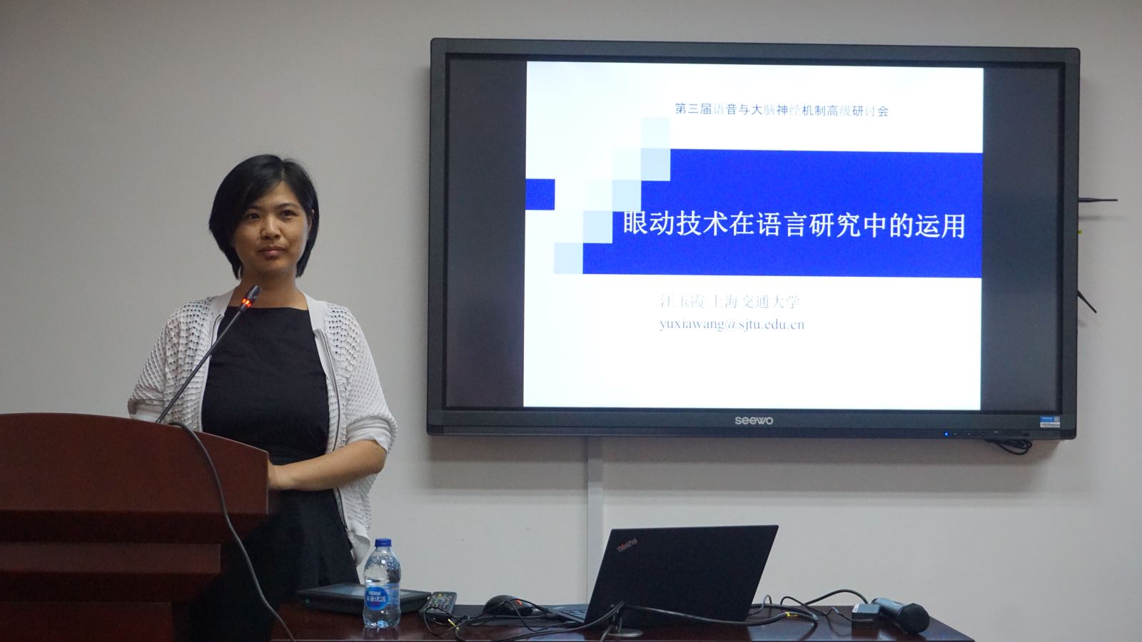 上海交通大学语言、智能与神经科学研究基地的副教授汪玉霞介绍了“眼动技术在语言研究中的运用”。眼动仪通过考察人的眼球运动来研究人的心理活动,通过分析记录到的眼动数据来探讨眼动与人的心理活动的关系,比如可生成眼动热力图,即以毫秒为单位,记录阅读注视点轨迹。相较于其他仪器,眼动仪的优势在于空间精确度高,操作容易,分析简单,能够处理自然加工任务,不需被试判断反馈,从而记录反应特征,时间以及分布,便于研究者进行早期、后期或回溯加工的分析;因此,眼动仪虽然无法探究深层脑内或情绪活动,但能够记录被试的行为表征,从而用于注意、视知觉、阅读等领域的研究。经典的例子是句子或篇章阅读,可记录被试的注视时间(fixation),扫视范围(saccades)和移动轨迹等。在数据分析阶段,可分为早期效应(如单词识别,早期语义加工),记录的数据有单次注视时间,首次注视时间等;晚期效应(如句子整合,语义整合),记录的数据有重复阅读时间等。基于眼动仪的优势,研究者可在心理学、语言学、社会学等方面做研究。