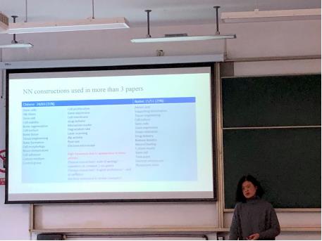 雷秀云老师的报告题目是“中国学者英语研究论文中名词+名词使用情况研究”。她借助语料库工具对比了中国学者和英语母语学者在英语期刊文章中的名名使用情况,发现中国学者的名名使用频率比英语母语学者更高,但变化更少。