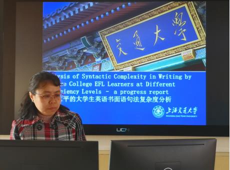 陆元雯老师的报告题目是“不同水平的英语学习者书面语句法复杂度分析”。报告讨论高水平和低水平英语学习者的书面语表达的句法复杂度是否存在差异,并对这种差异所体现的意义做出了分析。
