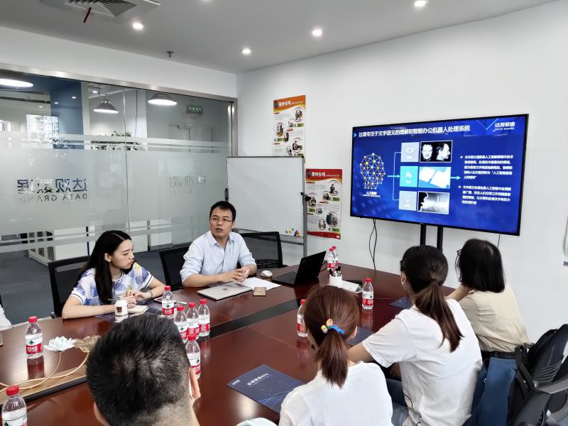 抵达公司后,达观数据的工作人员热情接待了实践团,并首先就公司总体情况和业务发展做全面介绍。公司副总裁王文广先生做主旨报告,向同学们细致阐释了公司运用人工智能技术与深度学习算法实现文本识别、文本分析与语义理解,搭建自然语言处理(NLP)平台,并在此基础上开发、运用一系列产品的过程。在他系统全面的介绍下,同学们对语言文本智能有了更加清晰的认识,了解到达观数据设计开发的文字识别(OCR)技术、文本挖掘引擎、机器人流程自动化(RPA)技术在银行、证券、法律、医疗、金融服务、公共服务等领域的广泛运用。在讲解RPA技术时,同学们被展示视频中这一自动化工具在工作时所体现的速度与精度所吸引,对于人工智能的广阔发展前景有了更加直观的认识,并对语言学与人工智能相结合的文理交叉趋势有了更加深刻的理解。