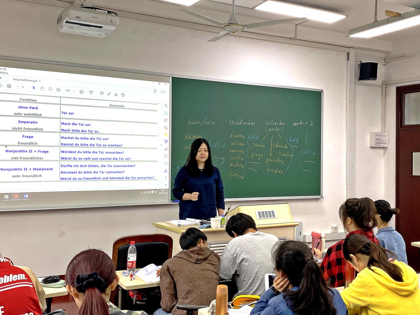在教学方面,李菲老师自2015年以来,承担德语专业二年级基础阶段主要教学任务,先后承担了包括《基础德语1、2》、《基础德语3、4》、《德语视听说2、3》、《德语二外》和《德语语法》等本科课程和《德语词汇学》的研究生课程;自2019年开始承担部分专业选修课《语言智能》课程;学期平均课时160小时,教学评教良好;2019年负责的3门课程《基础德语3》、《德语视听说2》和《语言智能》评教结果分别是A0、A1、A0。平均每年指导2名本科生毕业论文,1名研究毕业论文,鼓励学生进行语言学方向的研究,进入世界知名语言学类专业深造,辅导的本科学生在剑桥等学校应用语言学专业就读硕士和博士。负责德语专业四级考试的辅导和组织工作,班级四级考试成绩一直名列全国前茅,2019年德语专业四级考试通过率100%,优良率100%,优秀率82%,平均分86.7(全国最高分87.12)。