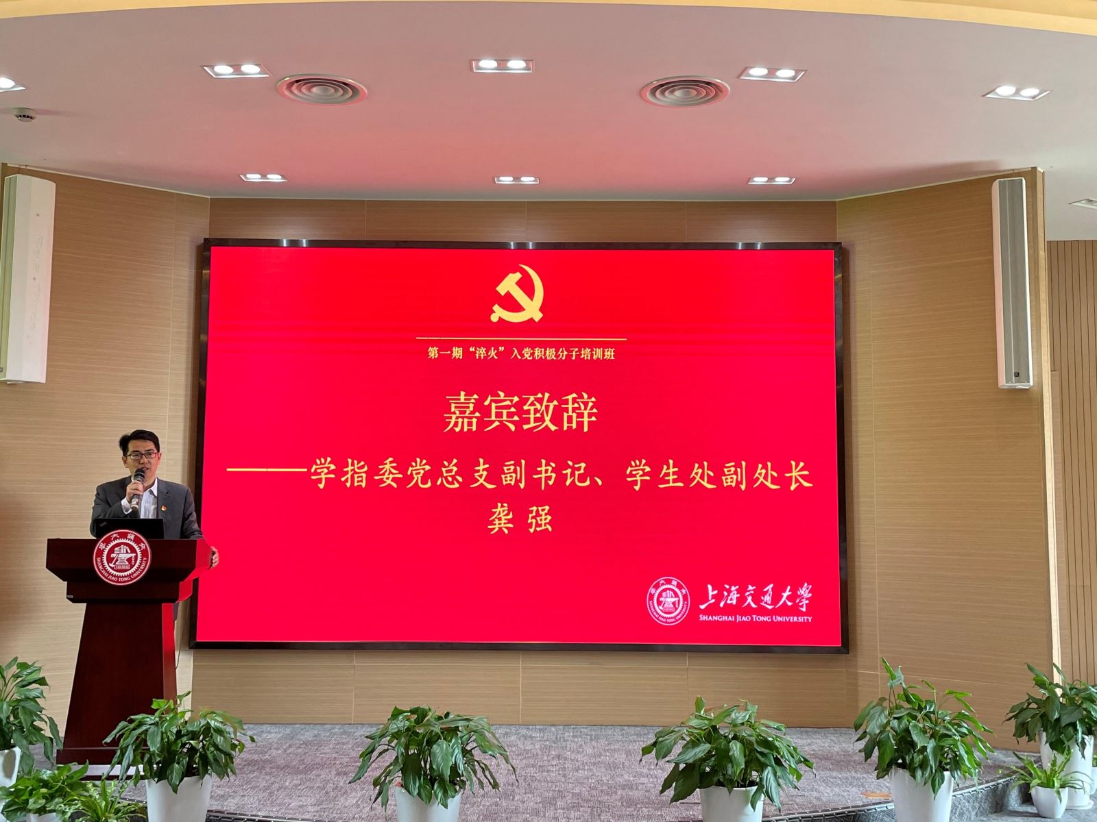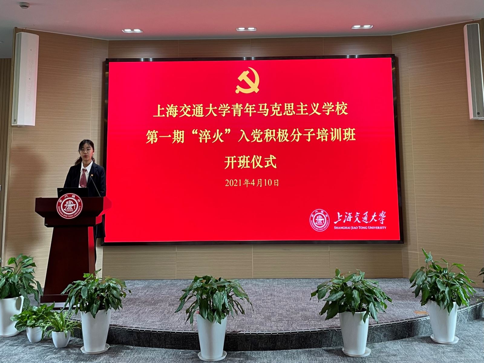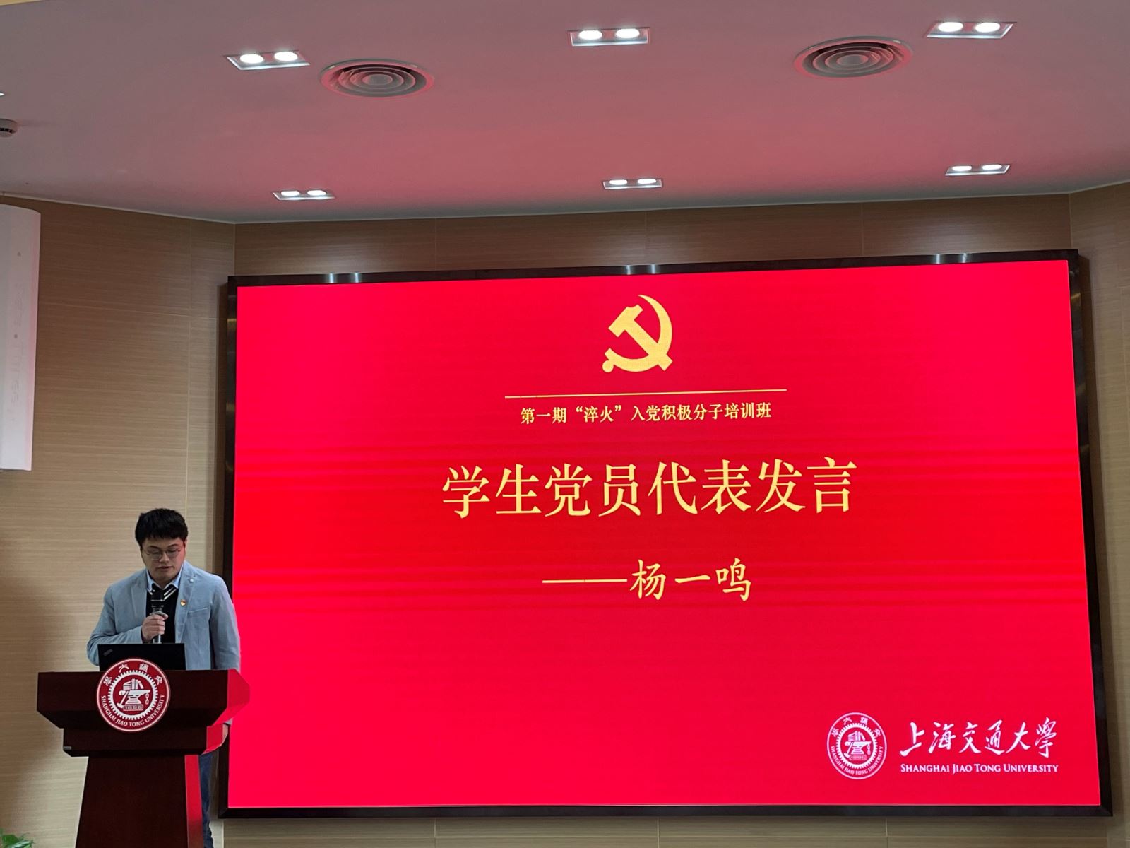 学生党员代表、交大密西根学院学生六支部党支书杨一鸣同学结合个人经历,向在座学员提出三点学习建议:一是要端正入党动机,从思想上靠近党组织;二是要坚定理想信念,坚定对马克思主义和社会主义的信仰;三是要陶冶自身情操,做习近平新时代中国特色社会主义思想的忠实实践者。