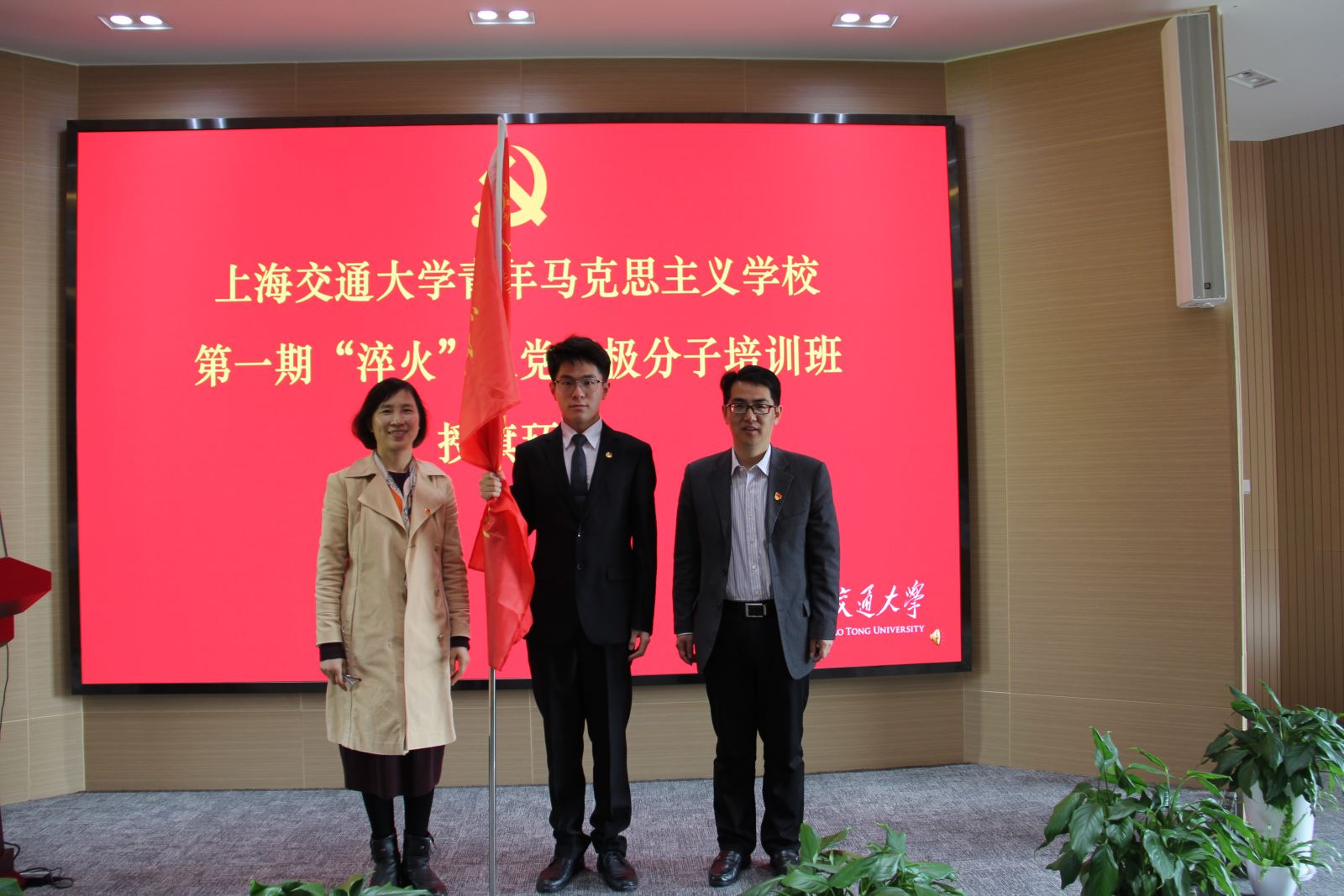 授旗仪式上,龚强、喜苏南两位老师为第一期“淬火”入党积极分子培训班授旗,学员代表交大巴黎高科学院2018级本科生周敬皓接旗。培训班正式开班。