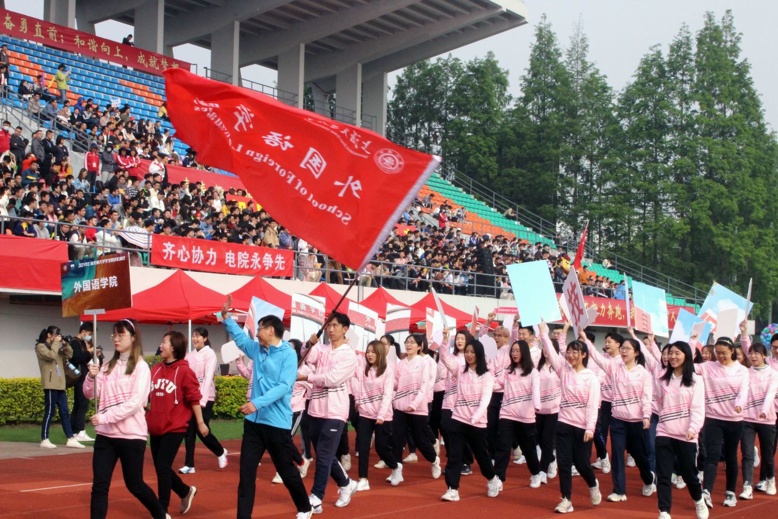 开幕式上,丁剑、朱一凡带队入场。学院入场方阵结合院系学科特色,配合趣味标语拼图,师生齐呼院训,步伐整齐有力,展示了良好的精神面貌。