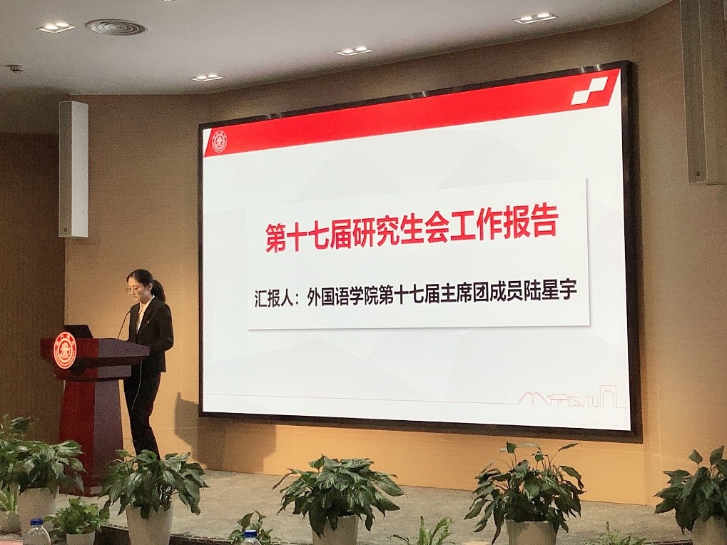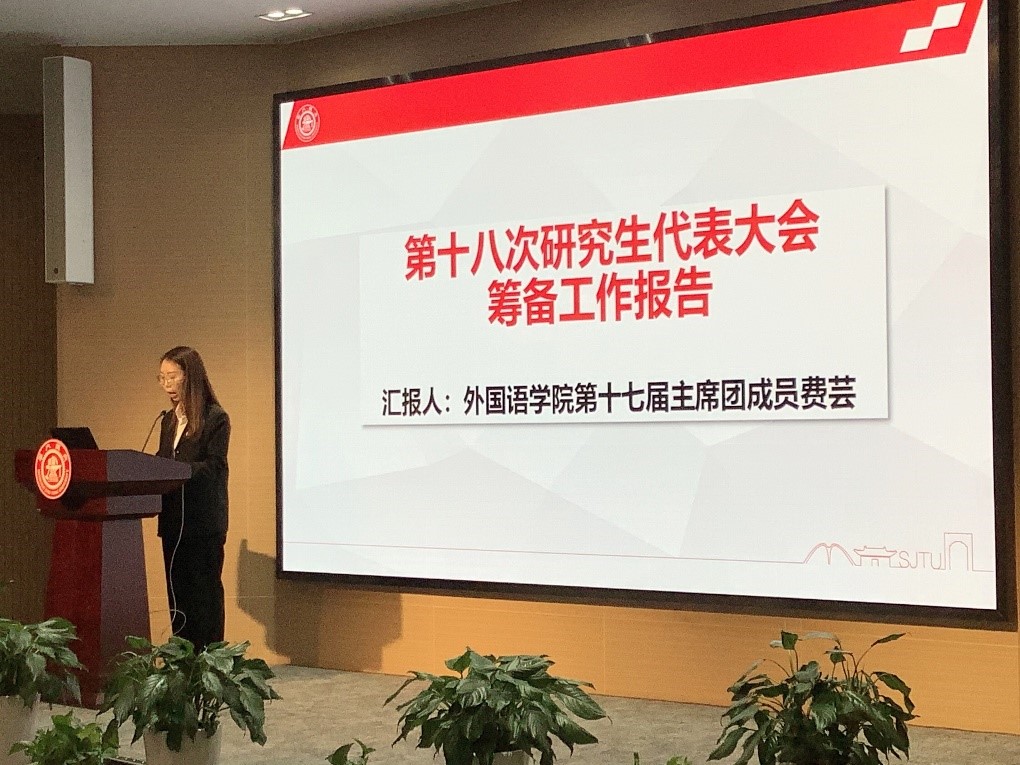 学院第十七届研究生会主席团成员费芸做大会筹备工作报告。筹委会在院系领导老师的指导下,以严谨踏实的态度为本次研代会的顺利召开做了大量基础性工作。