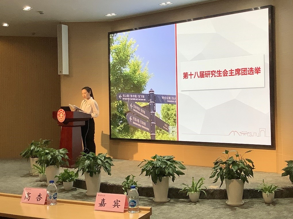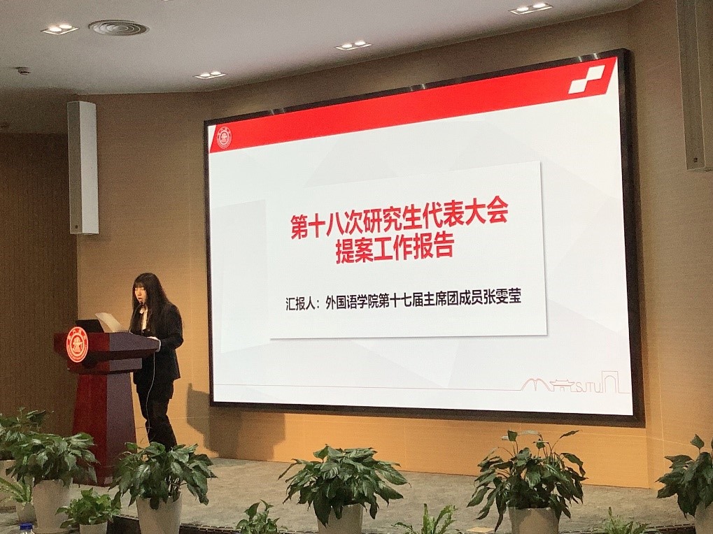 第十七届主席团成员张雯莹做大会提案工作报告。从教学活动开展、校园生活完善、职业发展规划三大板块,反映了学院研究生对学院、对研究生会工作的积极建议。