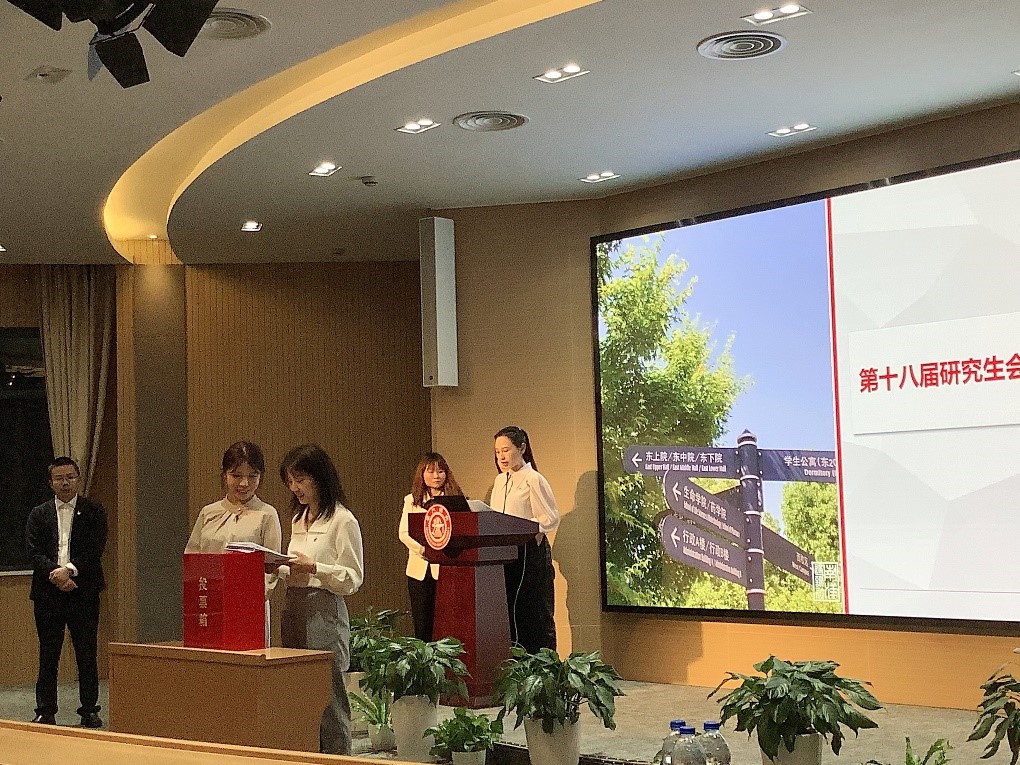 第十七届主席团成员陆星宇做第十七届研究生会工作报告。过去一年内,研究生会以“团结、求实、进取、创新”为指引,以人性化管理为基础,对外联系兄弟院系、展示学院风采,对内创新活动载体、精致校园生活,开展了一系列具有学院特色的品牌活动,为打造特色校园文化、加强内外建设做出了积极贡献。之后,主持人宣读了研究生会评优名单,并进行表彰。