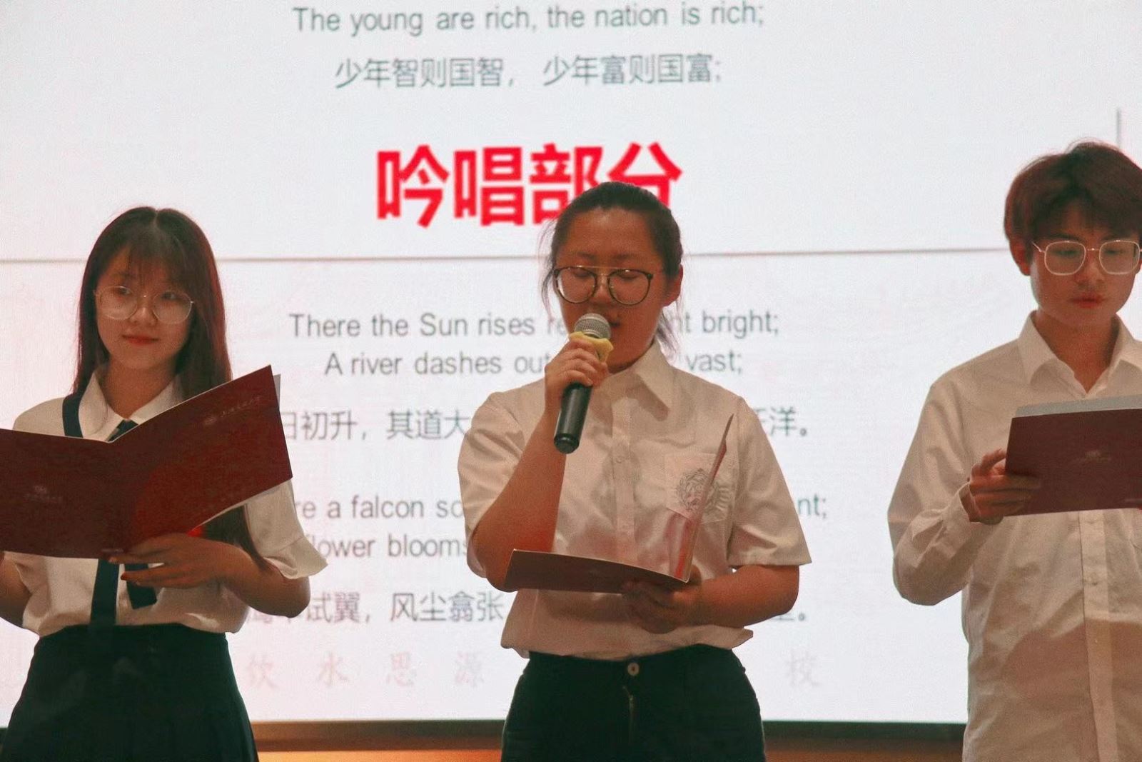 休会期间,屠思琪、张光正、滕沁芫、高茁瑞、郭思航五位同学带来了多语种《少年中国说》朗诵节目,融合诗朗诵、单人吟唱和合唱等多种形式进行展示,受到了广大师生的好评。