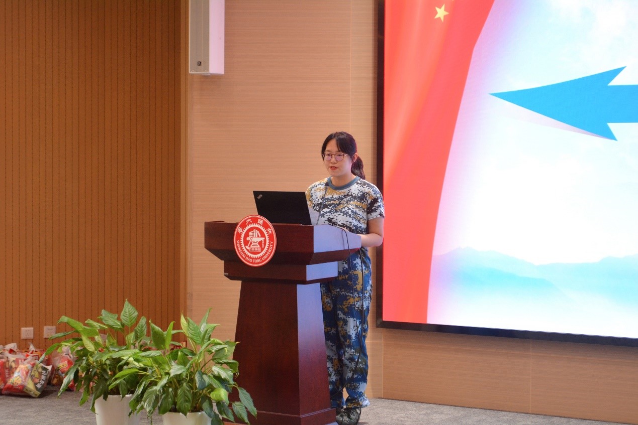 2019级日语系王静怡同学代表参训女生发言。她谈到,军训不仅让自己品尝了军人生活的酸甜苦辣,也提高了身体素质和心理素质,增强了自我教育、自我管理的能力。未来自己也会将团结一致的精神、坚如磐石的信心、坚韧不拔的毅力、奋勇无前的劲头发扬下去,钻研理论知识,丰富实践经验,乘风破浪,展现交大学子的风采。