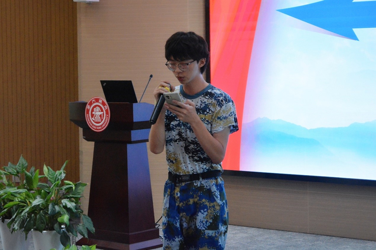 2019级德语系何佳浩同学代表参训男生发言。他从自己担任小班长的亲身实例谈起,展现外院学子严谨认真、追求卓越的训练态度和拼搏进取、超越自我的精神面貌。他谈到,军训对大学生的综合素质有重要的促进作用,在接下来的训练中,自己和同学们也会发扬强大凝聚力与勇于拼搏的品质,争取更大的进步。