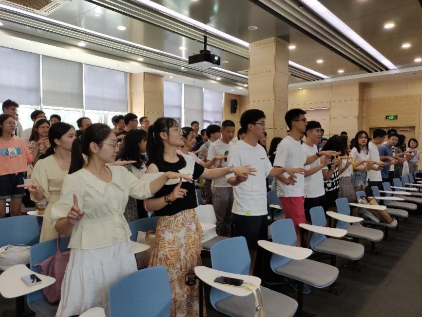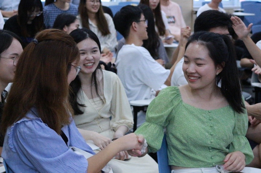 活动正式开始前,在培训师的提议下,同学们与周围同学握手拥抱,并进行了“空手道”等有趣的热身游戏,熟悉彼此,拉近距离。
