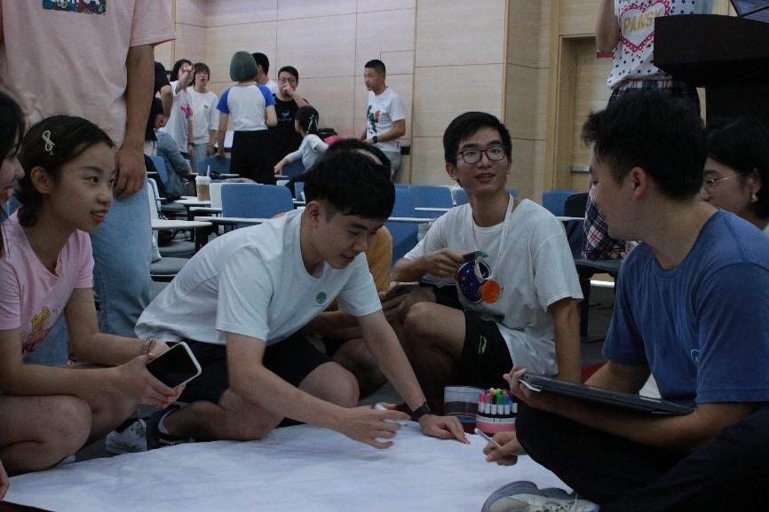 随后,同学们通过随机号码分成五组,进行团队建设。五支队伍各显神通,充分发挥了发散性思维和创造性才能,40分钟的准备后,依次展示队名、队歌、口号、队形、队旗等特色元素,精彩纷呈的团队介绍引来了阵阵的掌声。