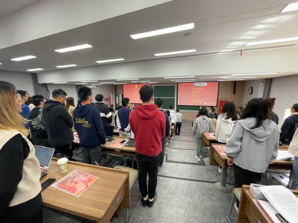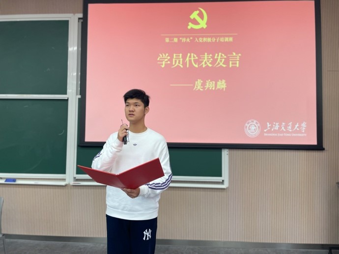 接着,学员代表巴黎卓越工程师学院21级本科生虞翔麟同学发言。他结合在新冠疫情中的亲身经历讲述了自己的入党动机和对于党的认识,并提出了在培训班中的学习目标与全体学员共勉:一是紧抓课堂,夯实理论基础;二是明确努力方向,在学习中提高综合素质,在组织上和思想上入党;三是学以致用,在实践中提高自身能力。