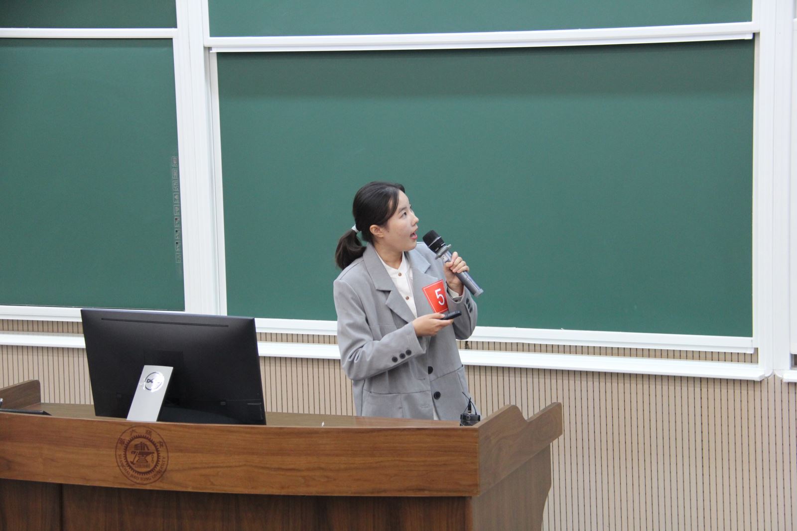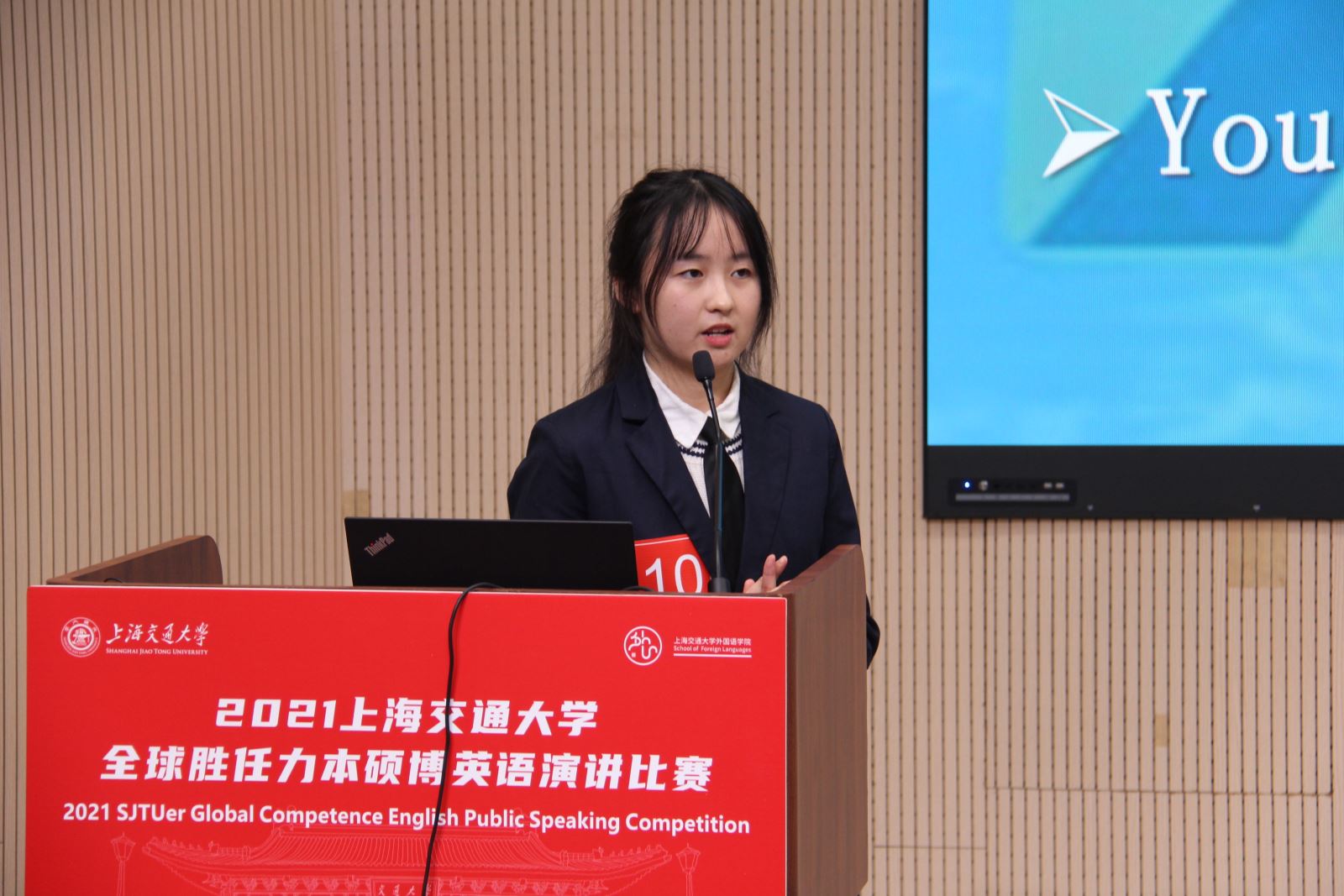 吴静怡为本次大赛作总结讲话。她代表学校对参赛同学取得的成绩表示热烈的祝贺,并向辛勤筹备大赛的老师和学生表示感谢。她指出,国际化是交大与生俱来的特色。自创立之初,交大的师资与课程就与国际接轨。近年来,学校在国际化办学方面取得了令人瞩目的成绩。在这样的背景下,首届上海交通大学“全球胜任力”本硕博英语演讲比赛通过对地区、全球和跨文化议题的拆解、与不同文化的互动与交融,加强了同学们对他人和世界的了解,在帮助学生提升英语公众演讲能力的同时,放眼全球发展,聚焦人类未来,成为国家的栋梁之才。学校希望并且相信同学们未来能成为具有使命感和责任心的交大人,用自己的才干为人民谋幸福,为民族谋复兴,为世界谋大同!她充分肯定了此次比赛,建议该比赛持续举办,并进一步扩大范围,扩大影响力。