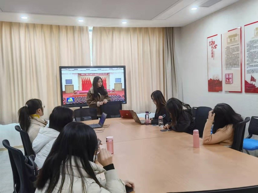 郝思涵回顾了中国共产党践行初心与使命的百年历程,详实生动地讲解了建党百年伟大成就,全面梳理了十九届中央委员会历次全会的主题和十九届五中全会以来的重要精神,并对十九届六中全会公报全文内容进行系统概述。立足外语专业特色,郝思涵重点带领支部党员学习了《中国共产党关于党的百年奋斗重大成就和历史经验的决议》官方译文。与会党员纷纷表示,新时代新征程,更要展现新气象新作为,从自身做起发挥党员先锋模范作用,把青春奋斗融入党和人民事业。