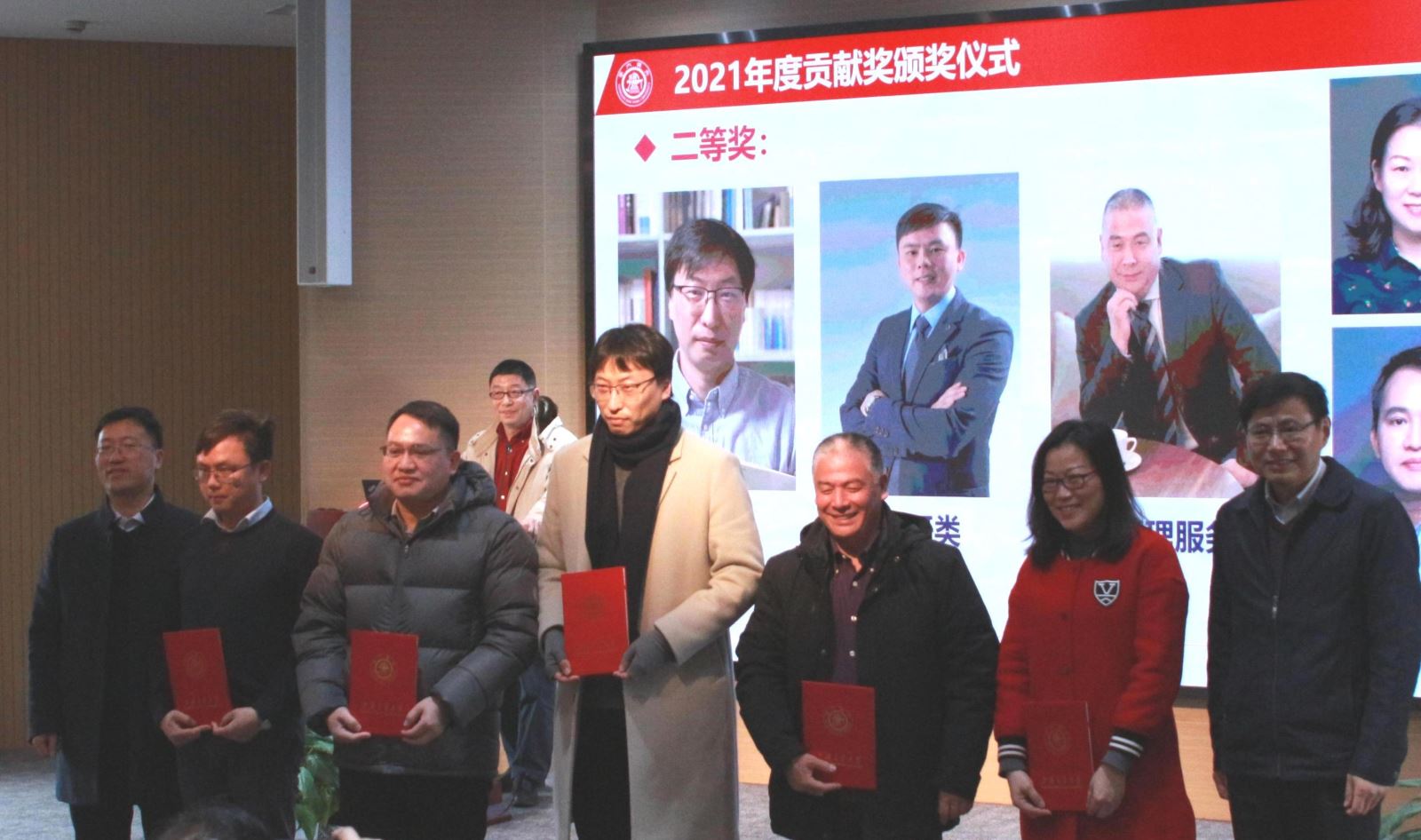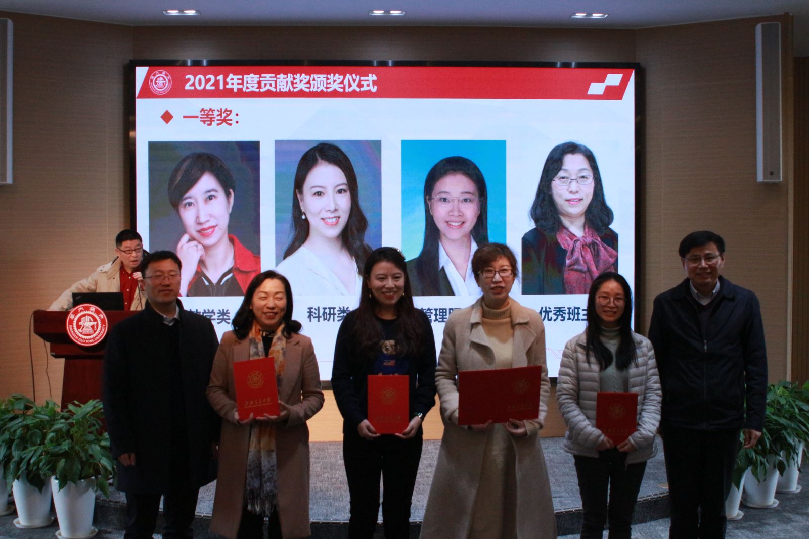 为表彰2021年在教学、科研、管理服务、班主任等一线工作做出突出贡献、并起到示范引领作用的先进教师,会上举行了学院年度贡献奖表彰颁奖仪式。