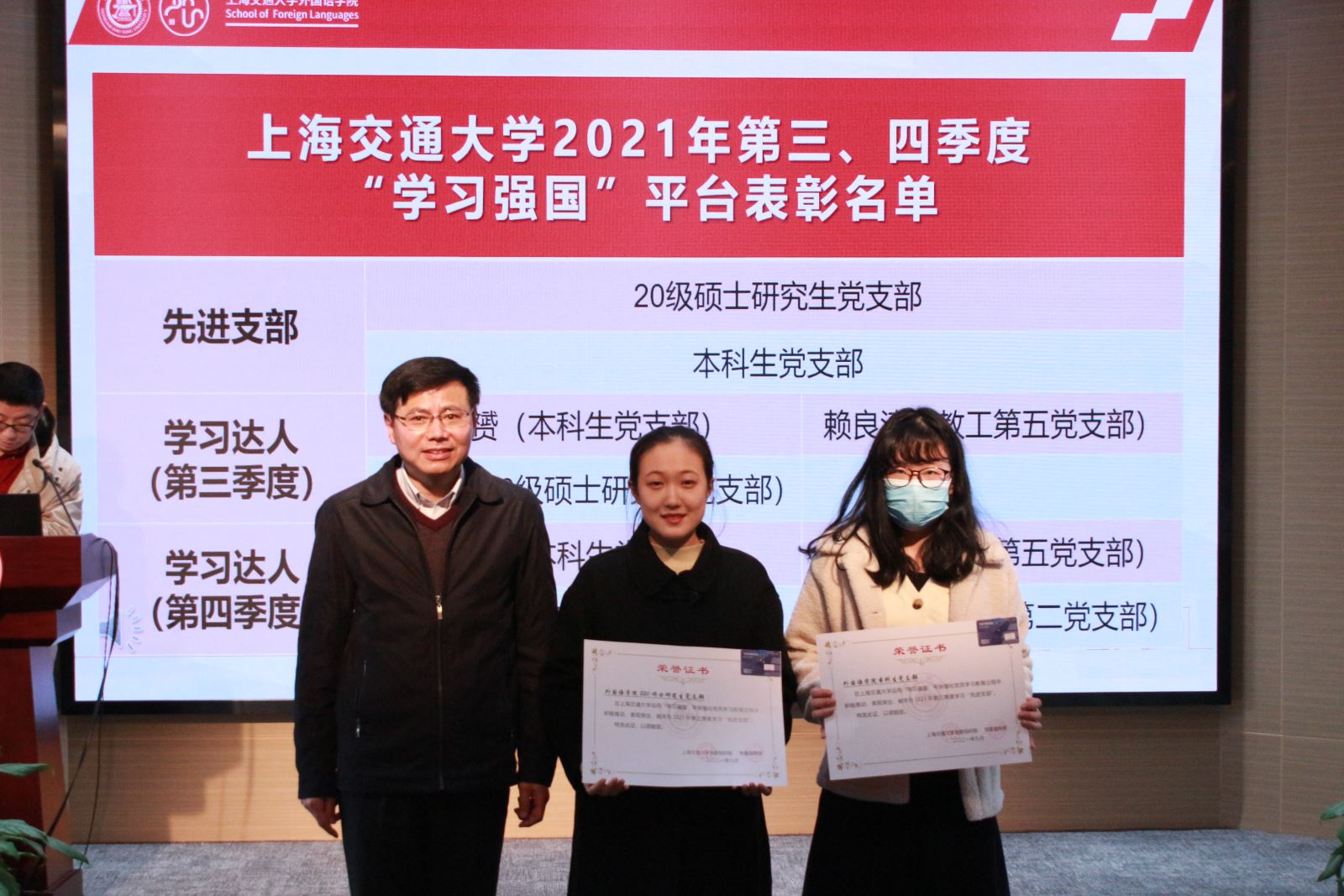 2020级硕士研究生党支部、教工第三党支部、本科生党支部、教工第六党支部、教工第一党支部和2021级硕士研究生党支部荣获学院学习先进党支部;赖良涛、邢连清、金晶、邓梦寒、郇昌鹏等教工党员及许孝峰、王艺、彭思源、张芃等学生党员荣获学院“学习积极分子”荣誉称号。丁剑、常辉为获奖师生颁奖。