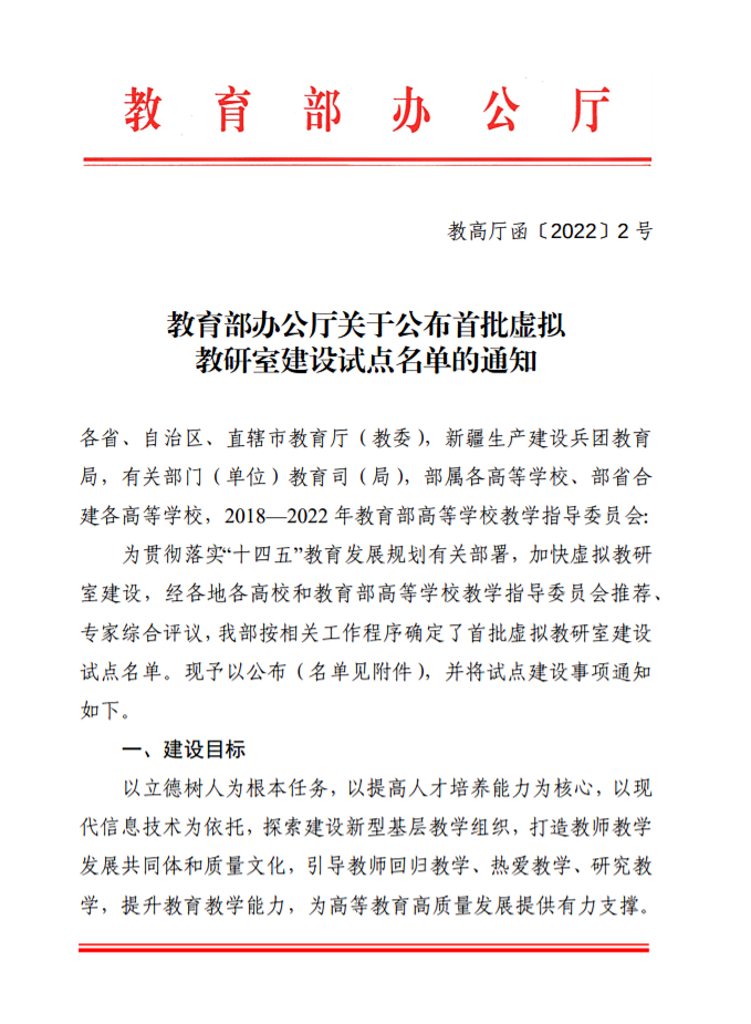虚拟教研室是我国信息化时代背景下加强新型基层教学组织建设的重要探索,将以现代信息技术为依托,突破时空限制,从而形成更加高效便捷的教师教研模式。教育部高等教育司在2021年7月启动了试点建设推荐工作,在实体教研室基础上以“国家级一流专业建设点”或“一流课程”为依托,旨在打造教师教学发展的共同体和质量文化,共同提升教育教学能力,主要建设任务包括创新教研形态、加强教学研究、共建优质资源、开展教师培训等。