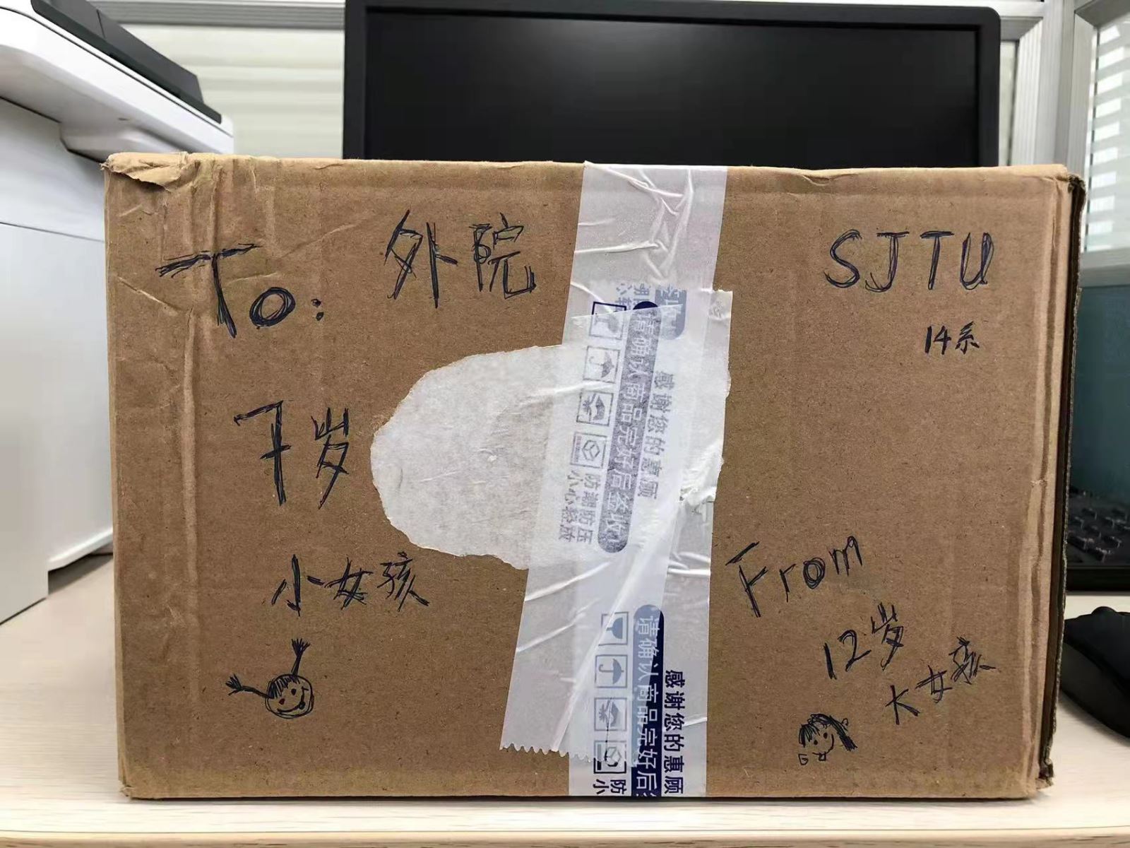 【一份礼物,两对父女】封校的第一天,王老师正要送女儿去上学。出校前,他们收到通知:闵行校区进入了闭环管理。3月12日,学校开始实施“足不出户”的防疫政策,几万名学生的吃饭成为了问题。身为教工第五党支部书记的王品毅然加入,成为送餐老师中的一员。带着孩子一起在闵行校区的宿舍区、学院、食堂三点一线。疫情逐渐严重,老师们按要求开始穿上防护服送餐,王老师只得将女儿一个人留在办公室,坚持为学生送餐。王老师说,即使睡着地铺,女儿也从没有吵着回家,这给予他莫大的支持,也让他无比自豪。但或许也是父亲的言传身教告诉了小朋友,让她明白,困难来临后,最大的勇气是“直面”。来自外院的校友陈震杰和12岁女儿得知学院里有这样一位可爱、懂事、勇敢的小姑娘,特地为他们送来了礼物,包装上写着给外院7岁小女孩,来自12岁大女孩,可爱的字体上满满的鼓励和关怀。