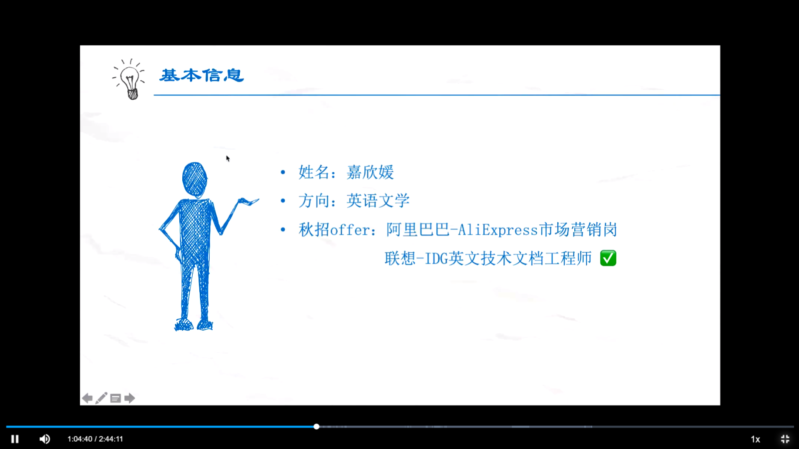 来自文学方向的嘉欣媛选择成为一名英文技术文档工程师。她向与会同学简要介绍该新兴岗位的基本信息、技能要求及晋升路径,结合自身秋招经历,鼓励同学们提前为心仪岗位做好准备。